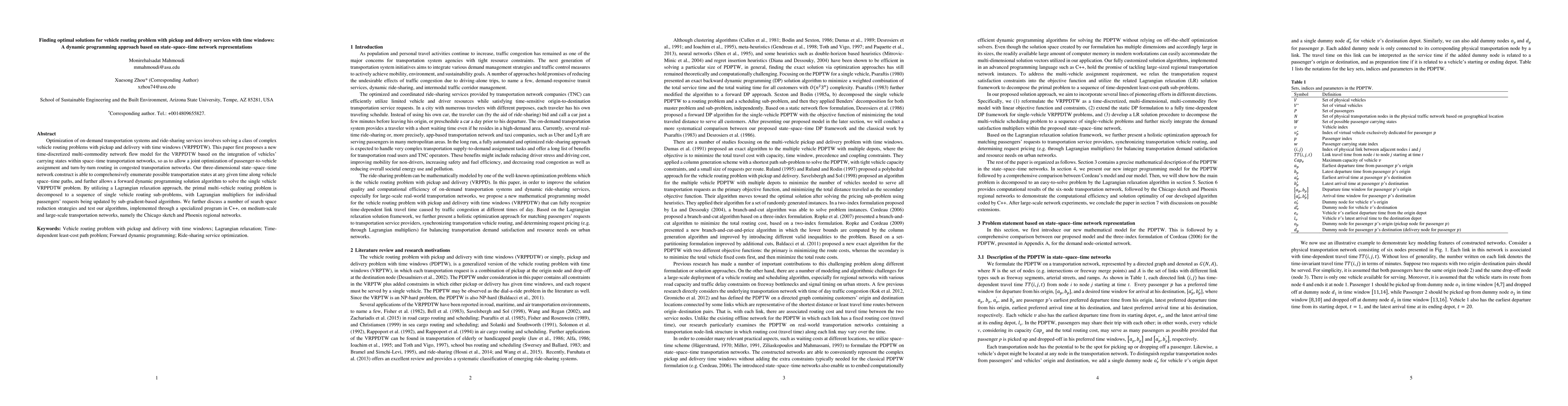 This paper proposes a dynamic programming approach based on a three-dimensional state-space-time network model to optimize vehicle routing problems with pickup and delivery services under time windows. The algorithm decomposes the multi-vehicle problem into single-vehicle sub-problems using Lagrangian relaxation and tests the method on Chicago and Phoenix transportation networks.