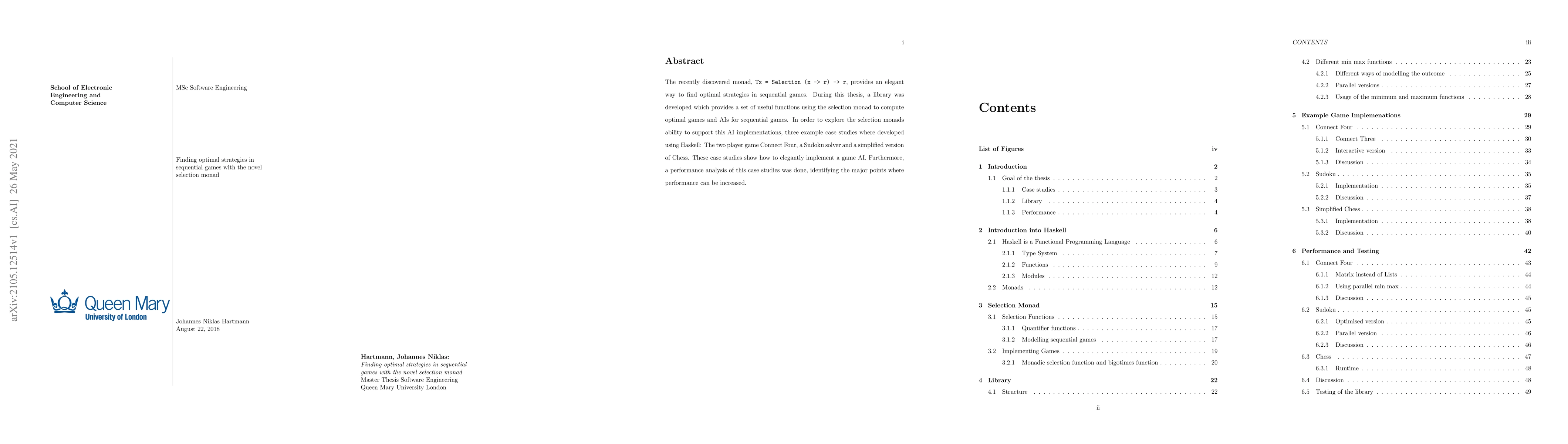This paper explores optimal strategies in sequential games using the novel selection monad, developing a Haskell library for computing optimal game AIs. Three case studies—Connect Four, Sudoku, and a simplified Chess—demonstrate the monad's effectiveness, alongside a performance analysis highlighting areas for improvement.
