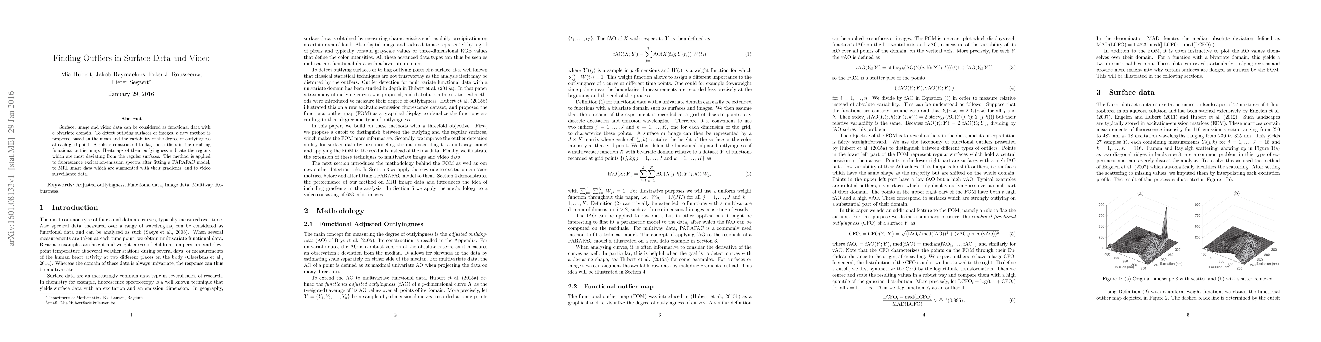 This paper proposes a novel method for detecting outliers in surface, image, and video data by analyzing mean and variability of degree of outlyingness at each grid point. The method flags outliers in a functional outlier map, with heatmaps highlighting the most deviating regions, and is demonstrated through applications on fluorescence spectra, MRI data, and video surveillance.