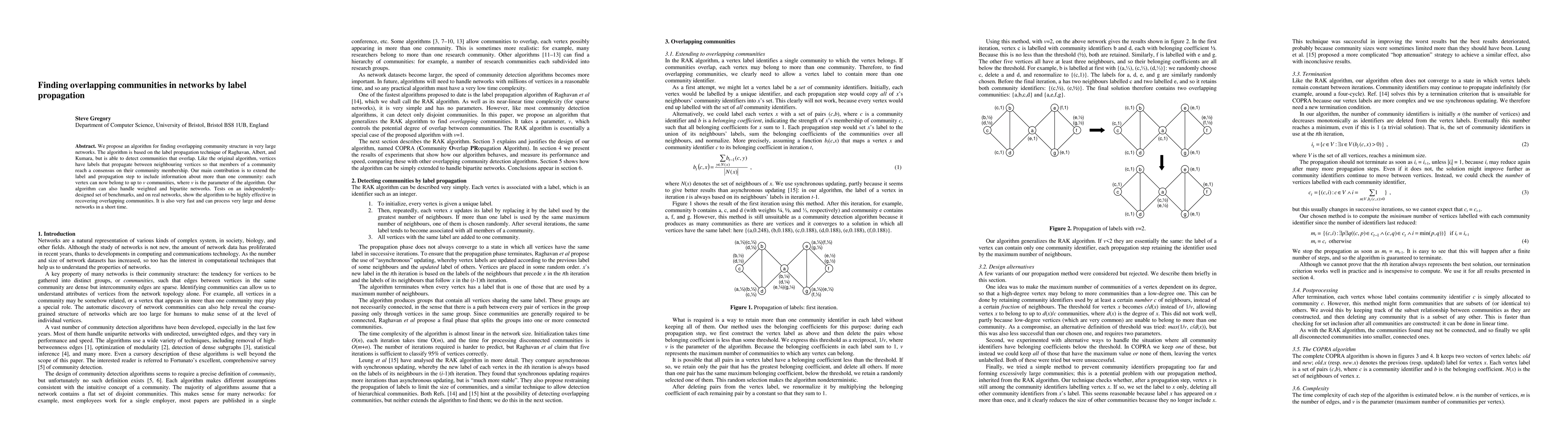 We propose an algorithm for finding overlapping community structure in very large networks. The algorithm is based on the label propagation technique of Raghavan, Albert, and Kumara, but is able to detect communities that overlap. Like the original algorithm, vertices have labels that propagate between neighbouring vertices so that members of a community reach a consensus on their community membership. Our main contribution is to extend the label and propagation step to include information about more than one community: each vertex can now belong to up to v communities, where v is the parameter of the algorithm. Our algorithm can also handle weighted and bipartite networks. Tests on an independently designed set of benchmarks, and on real networks, show the algorithm to be highly effective in recovering overlapping communities. It is also very fast and can process very large and dense networks in a short time.