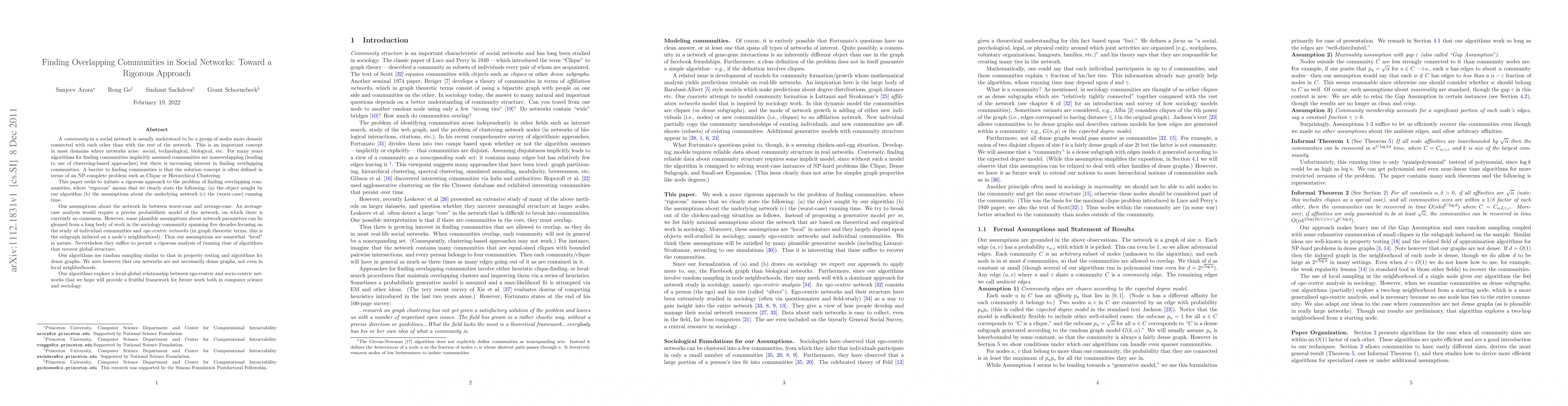 A "community" in a social network is usually understood to be a group of nodes more densely connected with each other than with the rest of the network. This is an important concept in most domains where networks arise: social, technological, biological, etc. For many years algorithms for finding communities implicitly assumed communities are nonoverlapping (leading to use of clustering-based approaches) but there is increasing interest in finding overlapping communities. A barrier to finding communities is that the solution concept is often defined in terms of an NP-complete problem such as Clique or Hierarchical Clustering. This paper seeks to initiate a rigorous approach to the problem of finding overlapping communities, where "rigorous" means that we clearly state the following: (a) the object sought by our algorithm (b) the assumptions about the underlying network (c) the (worst-case) running time. Our assumptions about the network lie between worst-case and average-case. An average case analysis would require a precise probabilistic model of the network, on which there is currently no consensus. However, some plausible assumptions about network parameters can be gleaned from a long body of work in the sociology community spanning five decades focusing on the study of individual communities and ego-centric networks. Thus our assumptions are somewhat "local" in nature. Nevertheless they suffice to permit a rigorous analysis of running time of algorithms that recover global structure. Our algorithms use random sampling similar to that in property testing and algorithms for dense graphs. However, our networks are not necessarily dense graphs, not even in local neighborhoods. Our algorithms explore a local-global relationship between ego-centric and socio-centric networks that we hope will provide a fruitful framework for future work both in computer science and sociology.