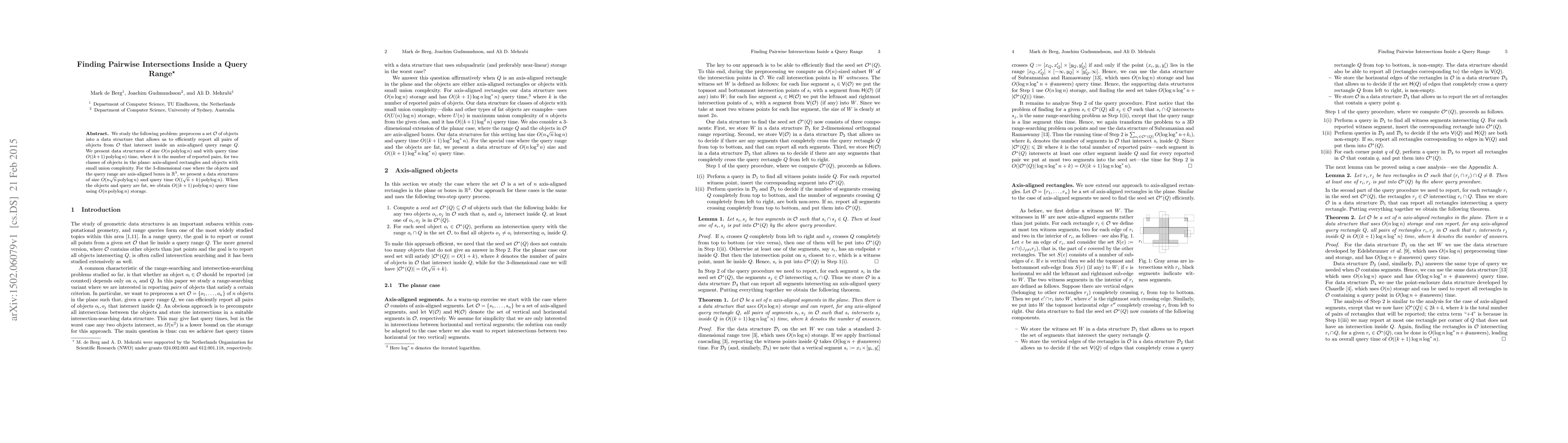 We study the following problem: preprocess a set O of objects into a data structure that allows us to efficiently report all pairs of objects from O that intersect inside an axis-aligned query range Q. We present data structures of size $O(n({\rm polylog} n))$ and with query time $O((k+1)({\rm polylog} n))$ time, where k is the number of reported pairs, for two classes of objects in the plane: axis-aligned rectangles and objects with small union complexity. For the 3-dimensional case where the objects and the query range are axis-aligned boxes in R^3, we present a data structures of size $O(n\sqrt{n}({\rm polylog} n))$ and query time $O((\sqrt{n}+k)({\rm polylog} n))$. When the objects and query are fat, we obtain $O((k+1)({\rm polylog} n))$ query time using $O(n({\rm polylog} n))$ storage.