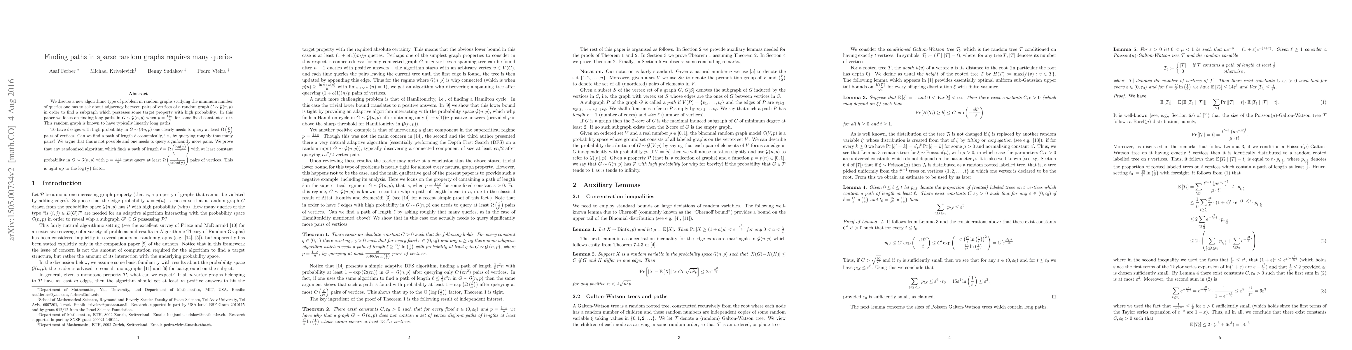 A new algorithmic problem study finds that finding long paths in sparse random graphs requires many queries beyond the number of expected edges, with a specific probability threshold of rac{1+ extsuperscript{ extperp}}{n}.