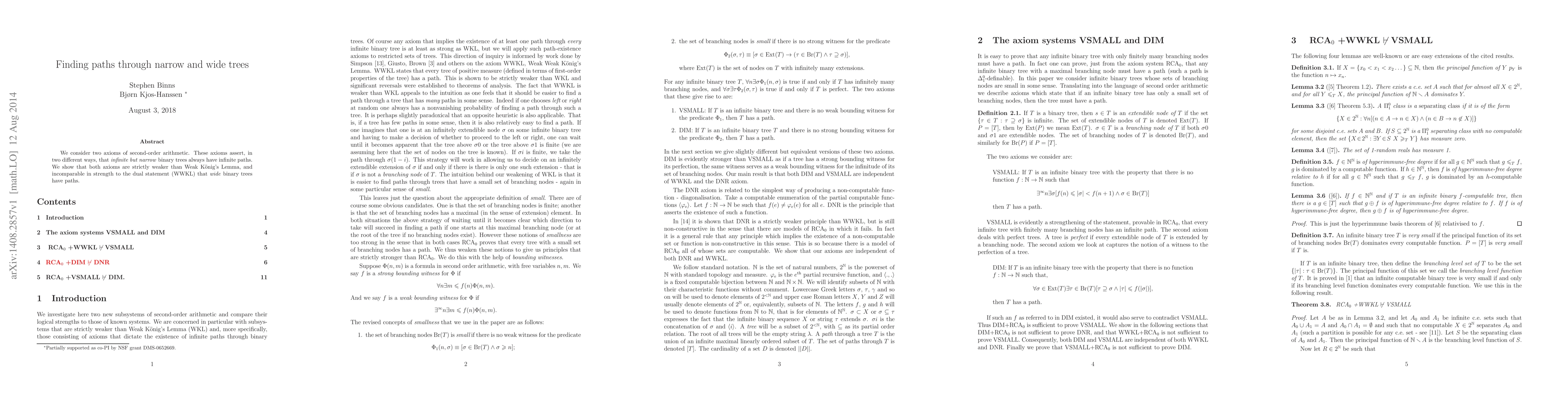 We consider two axioms of second-order arithmetic. These axioms assert, in two different ways, that infinite but narrow binary trees always have infinite paths. We show that both axioms are strictly weaker than Weak K\"onig's Lemma, and incomparable in strength to the dual statement (WWKL) that wide binary trees have paths.