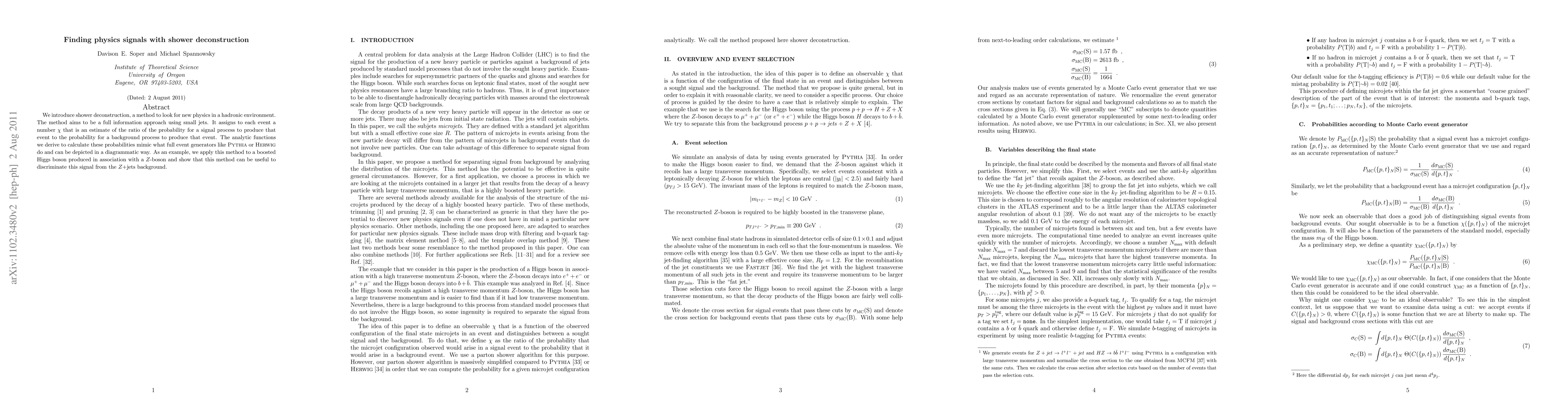 We introduce shower deconstruction, a method to look for new physics in a hadronic environment. The method aims to be a full information approach using small jets. It assigns to each event a number chi that is an estimate of the ratio of the probability for a signal process to produce that event to the probability for a background process to produce that event. The analytic functions we derive to calculate these probabilities mimic what full event generators like Pythia or Herwig do and can be depicted in a diagrammatic way. As an example, we apply this method to a boosted Higgs boson produced in association with a Z-boson and show that this method can be useful to discriminate this signal from the Z+jets background.