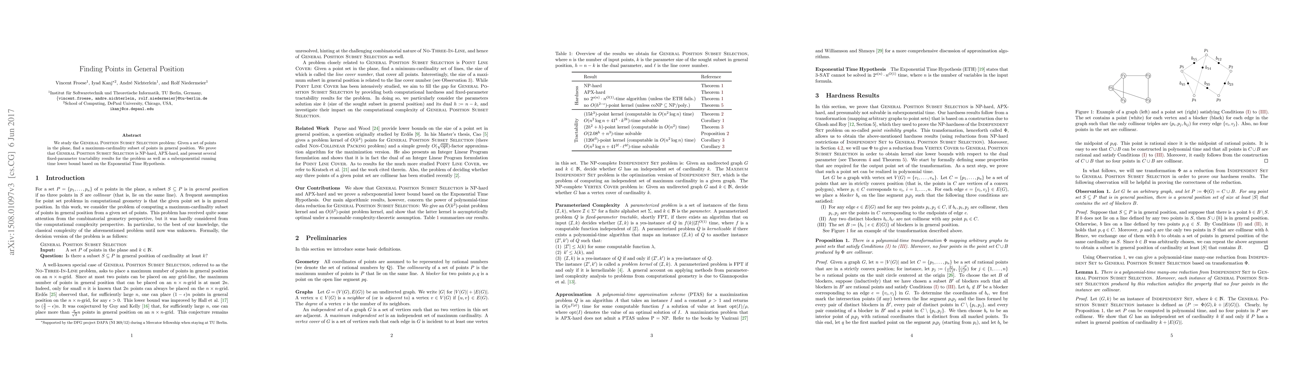 This paper investigates the computational complexity of selecting a maximum-cardinality subset of points in general position from a given set of points in the plane. It establishes the problem as NP-hard and APX-hard, while also presenting fixed-parameter tractability results and a subexponential running time lower bound under the Exponential Time Hypothesis.