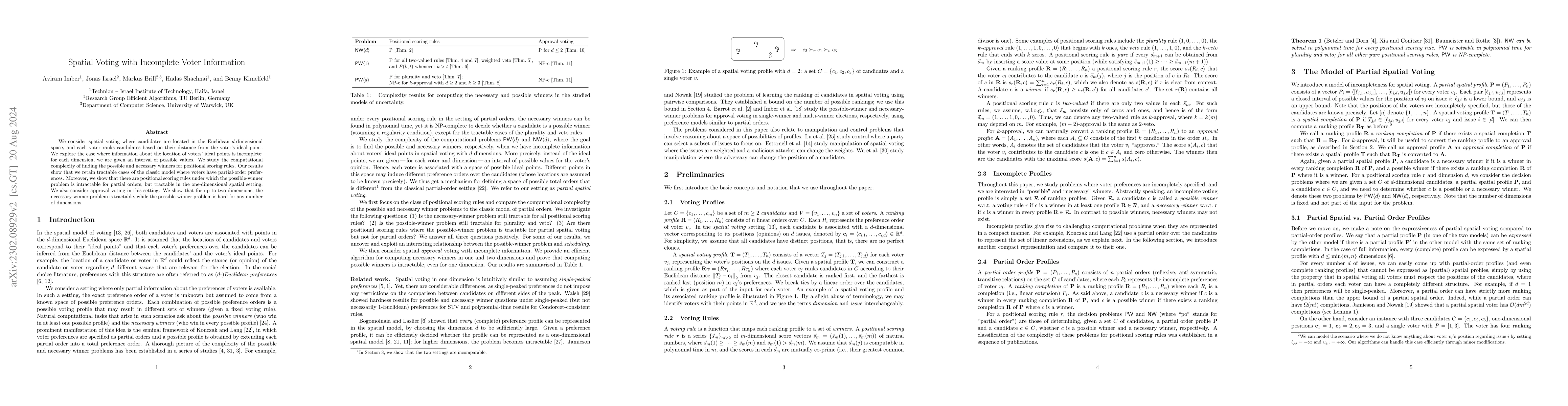 This paper investigates spatial voting models with partial information about voters' ideal points, focusing on the computational complexity of determining possible and necessary winners under positional scoring rules. It finds that while some cases remain tractable, the problem becomes intractable in higher dimensions for certain scoring rules.