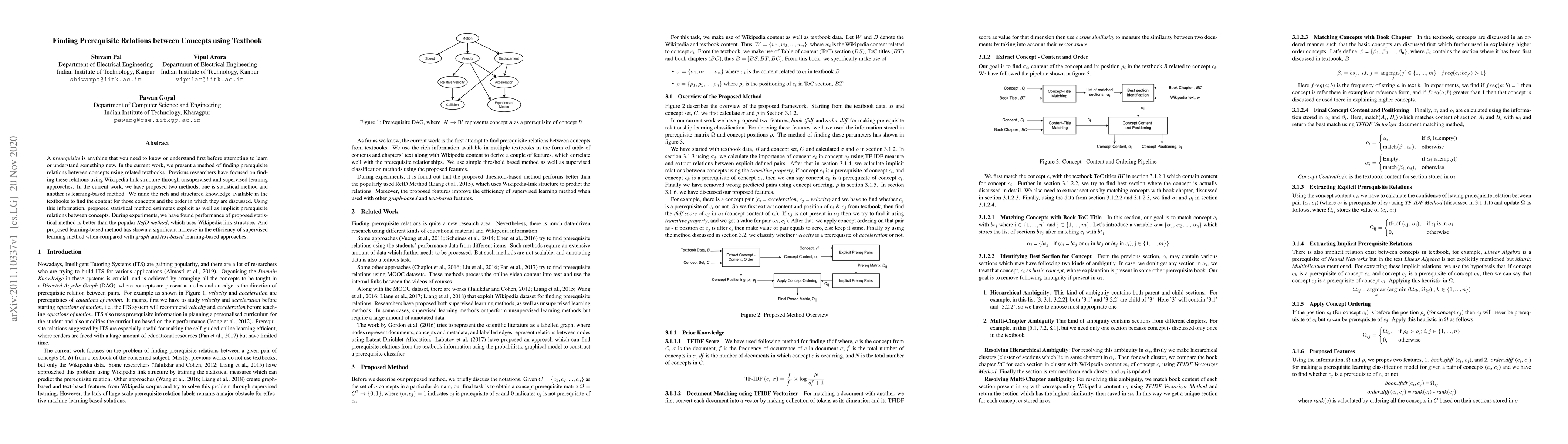 Researchers proposed two methods to find prerequisite relations between concepts using textbooks, outperforming a Wikipedia-based approach in some cases and improving the efficiency of supervised learning methods.
