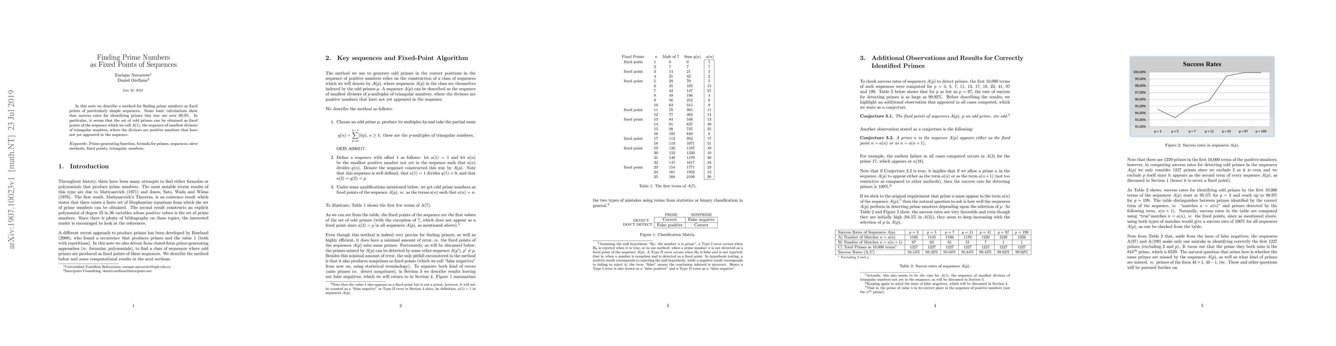 This paper presents a novel method to identify prime numbers as fixed points of a simple sequence, A(1), which consists of the smallest divisors of triangular numbers that haven't appeared before. The method boasts a success rate of over 99.9% in identifying prime numbers.