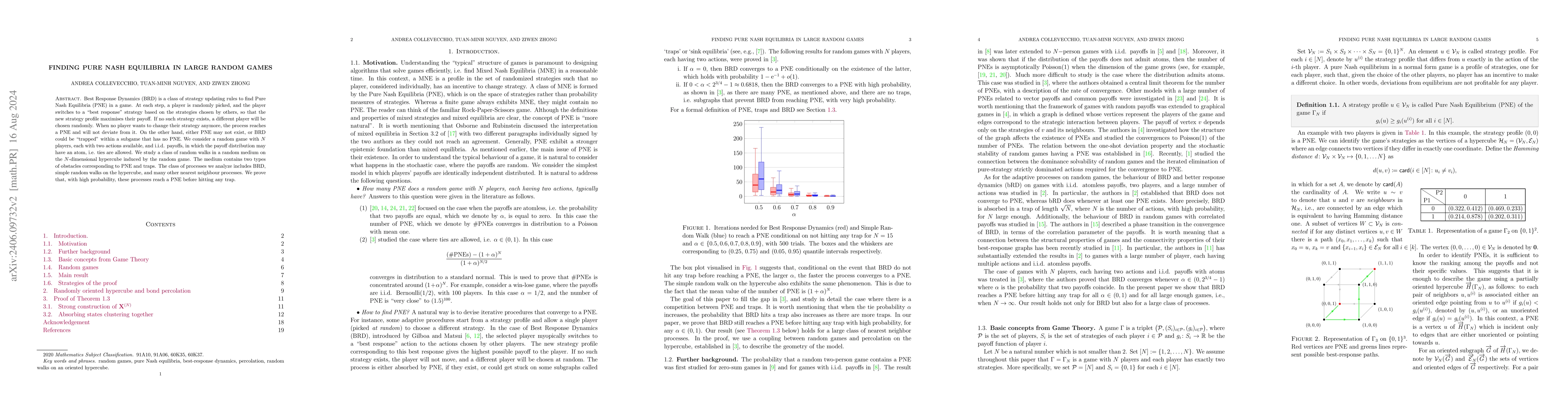 This paper explores the Best Response Dynamics (BRD) method to find Pure Nash Equilibria (PNE) in large random games with $N$ players, each having two possible actions. It proves that BRD typically converges to PNE rather than being trapped in subgames without PNE, establishing that such processes reach PNE before encountering traps with high probability.