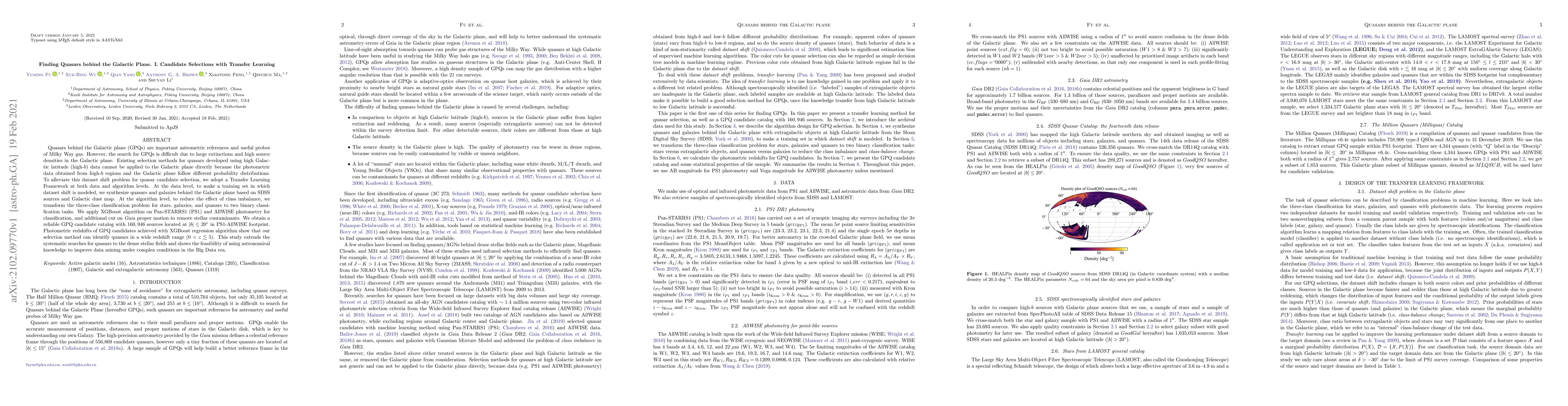 This study develops a new method to find quasars behind the Galactic plane using transfer learning and XGBoost algorithm, enabling reliable identification of quasars in dense stellar fields and wide redshift ranges.