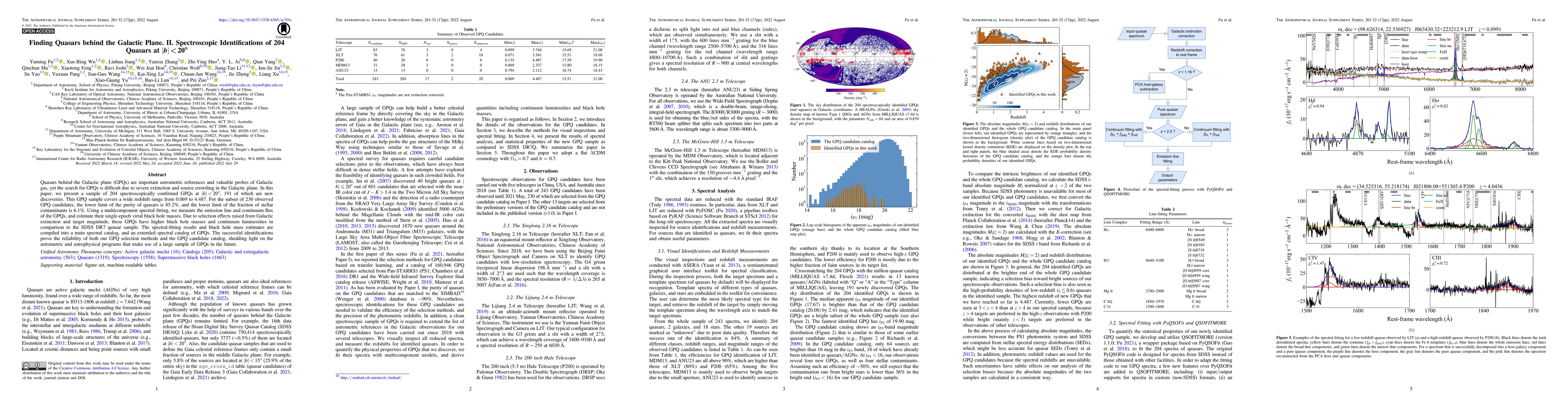 The research identifies 204 spectroscopically confirmed quasars behind the Galactic plane (GPQs) at |b|<20°, with 191 being new discoveries, using a sample that covers a wide redshift range from 0.069 to 4.487. The identification process involves multicomponent spectral fitting to measure emission line and continuum flux, and estimate single-epoch virial black hole masses.