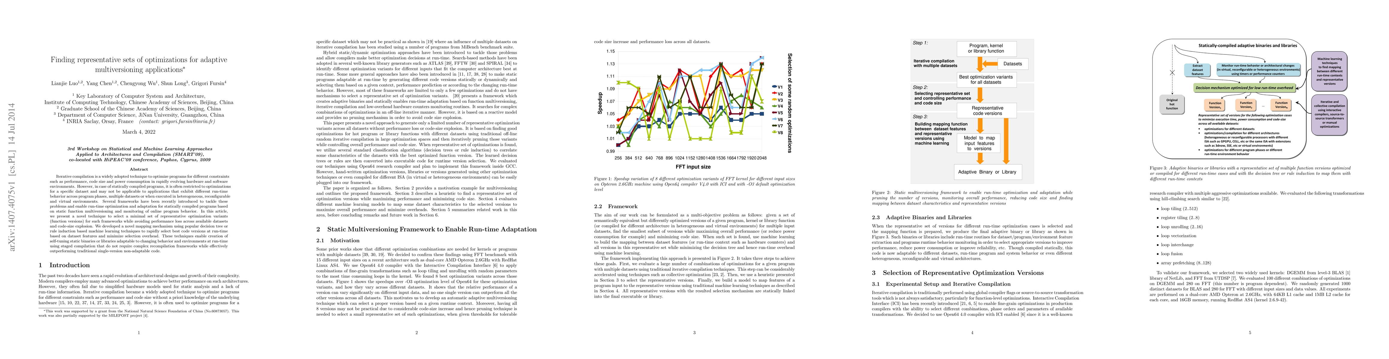 Iterative compilation is a widely adopted technique to optimize programs for different constraints such as performance, code size and power consumption in rapidly evolving hardware and software environments. However, in case of statically compiled programs, it is often restricted to optimizations for a specific dataset and may not be applicable to applications that exhibit different run-time behavior across program phases, multiple datasets or when executed in heterogeneous, reconfigurable and virtual environments. Several frameworks have been recently introduced to tackle these problems and enable run-time optimization and adaptation for statically compiled programs based on static function multiversioning and monitoring of online program behavior. In this article, we present a novel technique to select a minimal set of representative optimization variants (function versions) for such frameworks while avoiding performance loss across available datasets and code-size explosion. We developed a novel mapping mechanism using popular decision tree or rule induction based machine learning techniques to rapidly select best code versions at run-time based on dataset features and minimize selection overhead. These techniques enable creation of self-tuning static binaries or libraries adaptable to changing behavior and environments at run-time using staged compilation that do not require complex recompilation frameworks while effectively outperforming traditional single-version non-adaptable code.