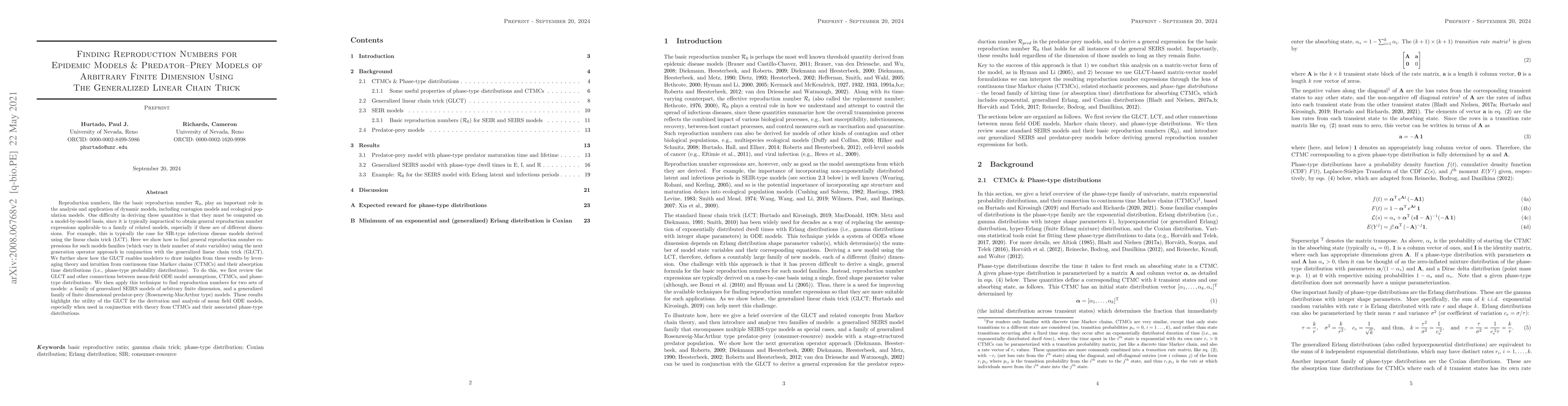 Reproduction numbers, like the basic reproduction number $\mathcal{R}_0$, play an important role in the analysis and application of dynamic models, including contagion models and ecological population models. One difficulty in deriving these quantities is that they must be computed on a model-by-model basis, since it is typically impractical to obtain general reproduction number expressions applicable to a family of related models, especially if these are of different dimensions. For example, this is typically the case for SIR-type infectious disease models derived using the linear chain trick (LCT). Here we show how to find general reproduction number expressions for such models families (which vary in their number of state variables) using the next generation operator approach in conjunction with the generalized linear chain trick (GLCT). We further show how the GLCT enables modelers to draw insights from these results by leveraging theory and intuition from continuous time Markov chains (CTMCs) and their absorption time distributions (i.e., phase-type probability distributions). To do this, we first review the GLCT and other connections between mean-field ODE model assumptions, CTMCs, and phase-type distributions. We then apply this technique to find reproduction numbers for two sets of models: a family of generalized SEIRS models of arbitrary finite dimension, and a generalized family of finite dimensional predator-prey (Rosenzweig-MacArthur type) models. These results highlight the utility of the GLCT for the derivation and analysis of mean field ODE models, especially when used in conjunction with theory from CTMCs and their associated phase-type distributions.
