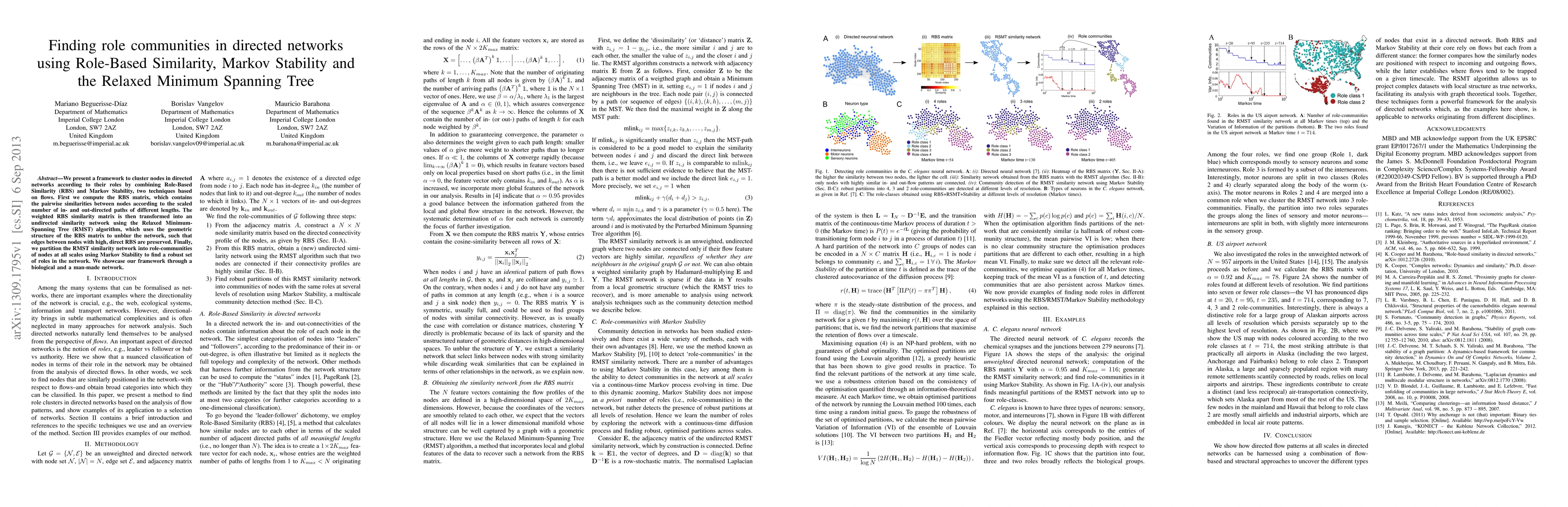 This paper proposes a framework to identify role communities in directed networks using Role-Based Similarity, Markov Stability, and the Relaxed Minimum Spanning Tree algorithm, with applications in biology and man-made networks.