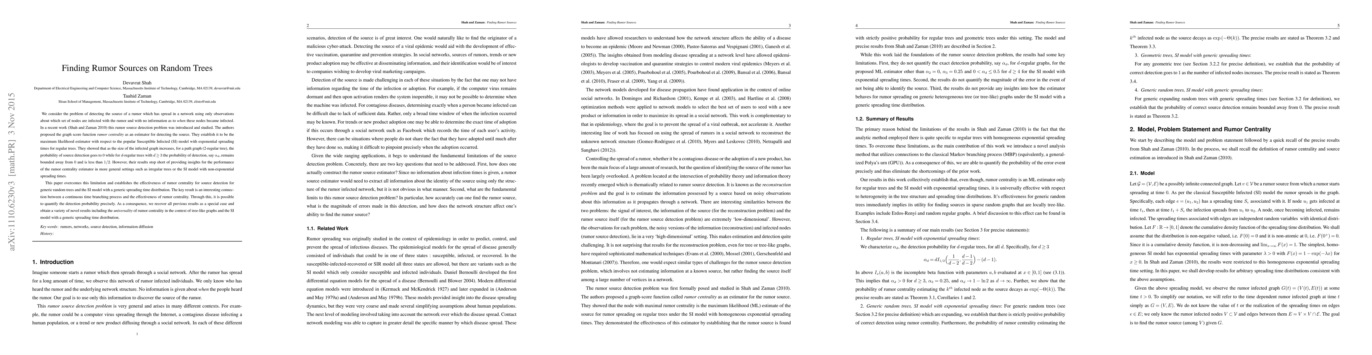 We consider the problem of detecting the source of a rumor which has spread in a network using only observations about which set of nodes are infected with the rumor and with no information as to \emph{when} these nodes became infected. In a recent work \citep{ref:rc} this rumor source detection problem was introduced and studied. The authors proposed the graph score function {\em rumor centrality} as an estimator for detecting the source. They establish it to be the maximum likelihood estimator with respect to the popular Susceptible Infected (SI) model with exponential spreading times for regular trees. They showed that as the size of the infected graph increases, for a path graph (2-regular tree), the probability of source detection goes to $0$ while for $d$-regular trees with $d \geq 3$ the probability of detection, say $\alpha_d$, remains bounded away from $0$ and is less than $1/2$. However, their results stop short of providing insights for the performance of the rumor centrality estimator in more general settings such as irregular trees or the SI model with non-exponential spreading times. This paper overcomes this limitation and establishes the effectiveness of rumor centrality for source detection for generic random trees and the SI model with a generic spreading time distribution. The key result is an interesting connection between a continuous time branching process and the effectiveness of rumor centrality. Through this, it is possible to quantify the detection probability precisely. As a consequence, we recover all previous results as a special case and obtain a variety of novel results including the {\em universality} of rumor centrality in the context of tree-like graphs and the SI model with a generic spreading time distribution.