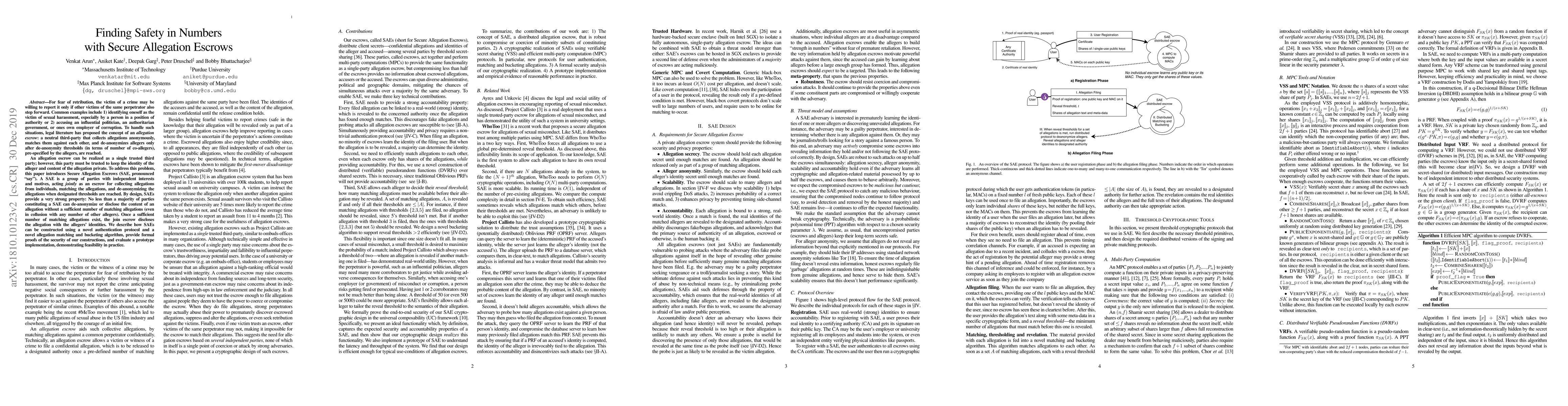 For fear of retribution, the victim of a crime may be willing to report it only if other victims of the same perpetrator also step forward. Common examples include 1) identifying oneself as the victim of sexual harassment, especially by a person in a position of authority or 2) accusing an influential politician, an authoritarian government, or ones own employer of corruption. To handle such situations, legal literature has proposed the concept of an allegation escrow: a neutral third-party that collects allegations anonymously, matches them against each other, and de-anonymizes allegers only after de-anonymity thresholds (in terms of number of co-allegers), pre-specified by the allegers, are reached. An allegation escrow can be realized as a single trusted third party; however, this party must be trusted to keep the identity of the alleger and content of the allegation private. To address this problem, this paper introduces Secure Allegation Escrows (SAE, pronounced "say"). A SAE is a group of parties with independent interests and motives, acting jointly as an escrow for collecting allegations from individuals, matching the allegations, and de-anonymizing the allegations when designated thresholds are reached. By design, SAEs provide a very strong property: No less than a majority of parties constituting a SAE can de-anonymize or disclose the content of an allegation without a sufficient number of matching allegations (even in collusion with any number of other allegers). Once a sufficient number of matching allegations exist, the join escrow discloses the allegation with the allegers' identities. We describe how SAEs can be constructed using a novel authentication protocol and a novel allegation matching and bucketing algorithm, provide formal proofs of the security of our constructions, and evaluate a prototype implementation, demonstrating feasibility in practice.