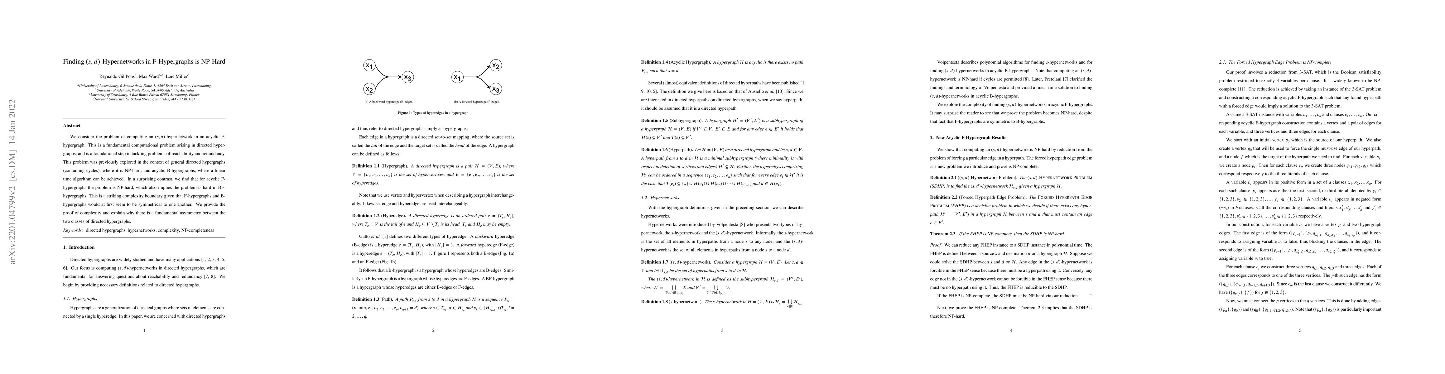 This paper demonstrates that finding $(s,d)$-hypernetworks in acyclic F-hypergraphs is NP-hard, contrasting with the linear time solvability in acyclic B-hypergraphs. This reveals a fundamental asymmetry in complexity between these seemingly symmetrical classes of directed hypergraphs.