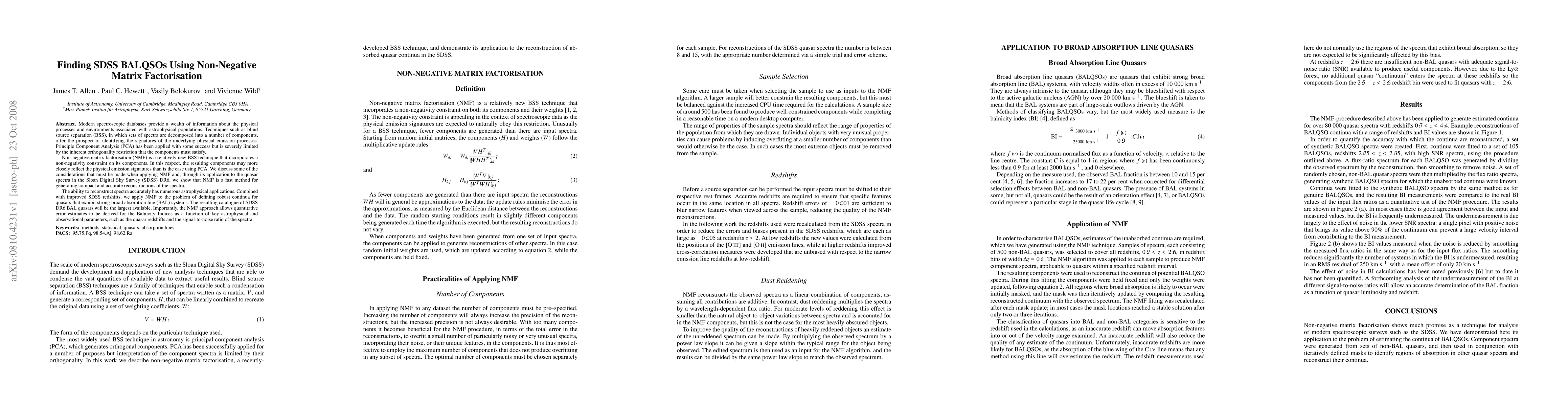 Modern spectroscopic databases provide a wealth of information about the physical processes and environments associated with astrophysical populations. Techniques such as blind source separation (BSS), in which sets of spectra are decomposed into a number of components, offer the prospect of identifying the signatures of the underlying physical emission processes. Principle Component Analysis (PCA) has been applied with some success but is severely limited by the inherent orthogonality restriction that the components must satisfy. Non-negative matrix factorisation (NMF) is a relatively new BSS technique that incorporates a non-negativity constraint on its components. In this respect, the resulting components may more closely reflect the physical emission signatures than is the case using PCA. We discuss some of the considerations that must be made when applying NMF and, through its application to the quasar spectra in the Sloan Digital Sky Survey (SDSS) DR6, we show that NMF is a fast method for generating compact and accurate reconstructions of the spectra. The ability to reconstruct spectra accurately has numerous astrophysical applications. Combined with improved SDSS redshifts, we apply NMF to the problem of defining robust continua for quasars that exhibit strong broad absorption line (BAL) systems. The resulting catalogue of SDSS DR6 BAL quasars will be the largest available. Importantly, the NMF approach allows quantitative error estimates to be derived for the Balnicity Indices as a function of key astrophysical and observational parameters, such as the quasar redshifts and the signal-to-noise ratio of the spectra.