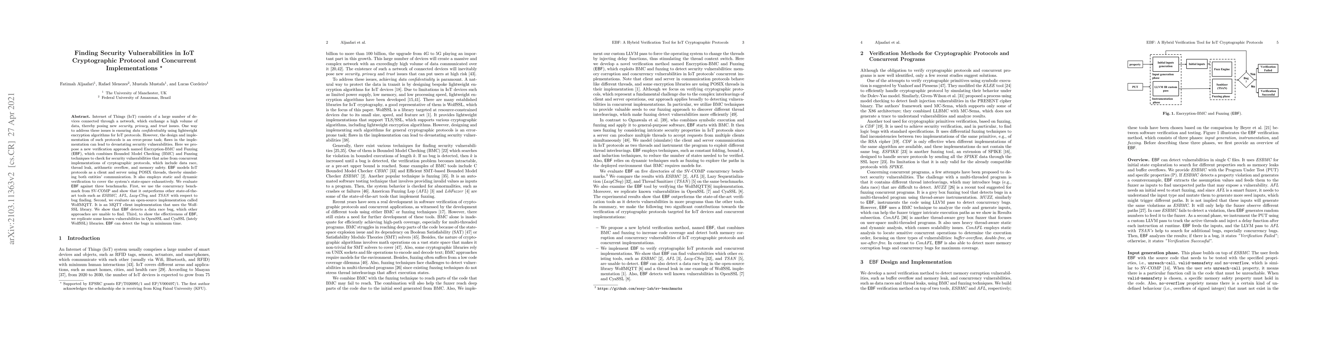 This paper proposes a new verification approach called Encryption-BMC and Fuzzing (EBF) to detect security vulnerabilities in IoT cryptographic protocols, particularly focusing on concurrent implementations. EBF combines Bounded Model Checking and Fuzzing to identify issues like data race, thread leaks, and memory safety problems, outperforming other tools in benchmark tests.