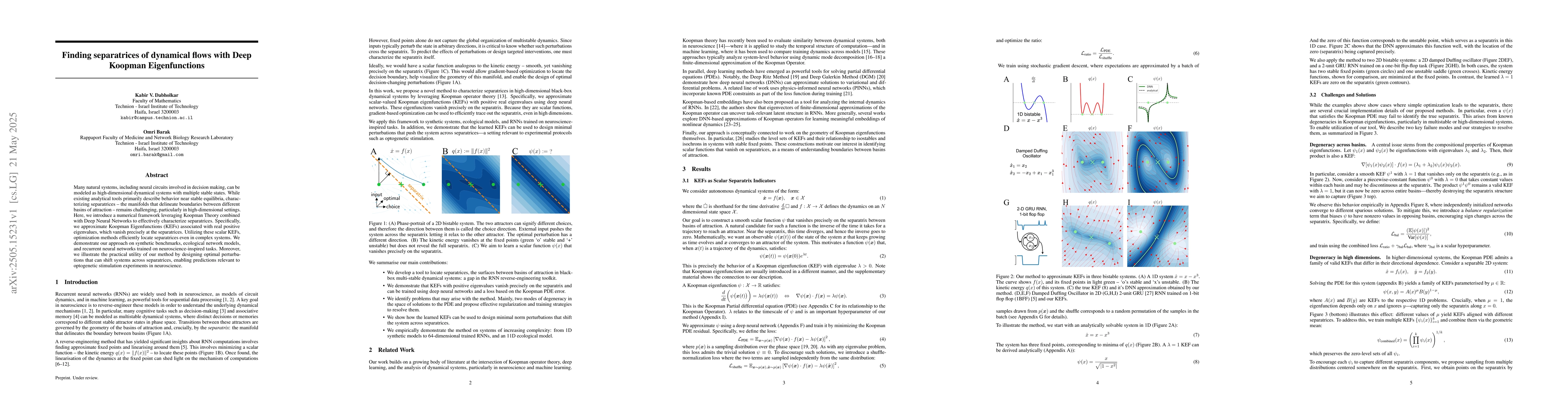 Many natural systems, including neural circuits involved in decision making, can be modeled as high-dimensional dynamical systems with multiple stable states. While existing analytical tools primarily describe behavior near stable equilibria, characterizing separatrices -- the manifolds that delineate boundaries between different basins of attraction -- remains challenging, particularly in high-dimensional settings. Here, we introduce a numerical framework leveraging Koopman Theory combined with Deep Neural Networks to effectively characterize separatrices. Specifically, we approximate Koopman Eigenfunctions (KEFs) associated with real positive eigenvalues, which vanish precisely at the separatrices. Utilizing these scalar KEFs, optimization methods efficiently locate separatrices even in complex systems. We demonstrate our approach on synthetic benchmarks, ecological network models, and recurrent neural networks trained on neuroscience-inspired tasks. Moreover, we illustrate the practical utility of our method by designing optimal perturbations that can shift systems across separatrices, enabling predictions relevant to optogenetic stimulation experiments in neuroscience.