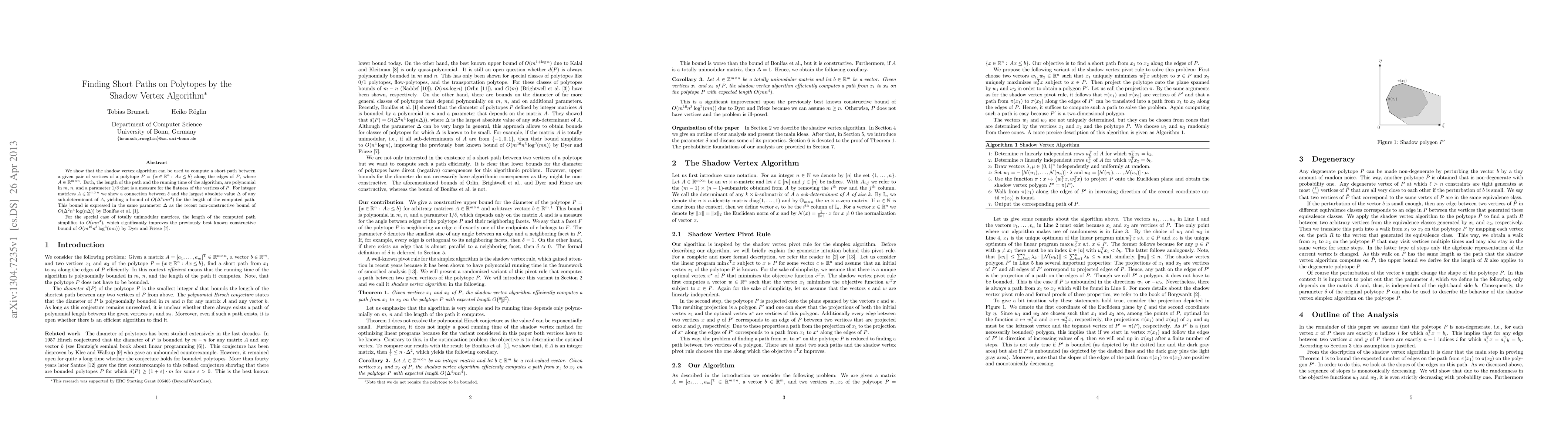 The shadow vertex algorithm efficiently computes a short path between vertices of a polytope, with path length and running time polynomial in dimensions and a flatness parameter. For integer matrices, it provides a constructive bound matching recent non-constructive bounds, and for totally unimodular matrices, it significantly improves the previous best constructive bound.