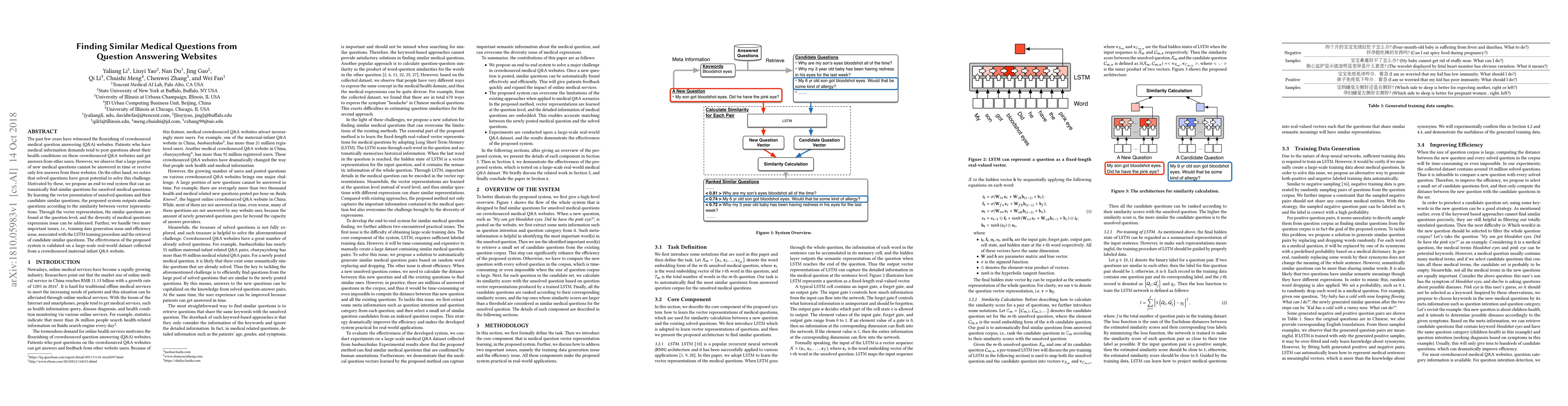 This paper proposes a system to automatically identify similar medical questions on crowdsourced Q&A websites to assist in answering unsolved questions. The system uses vector representations to find similar questions, addressing the diversity of question expressions and handling training data and efficiency issues. The effectiveness is validated on a dataset from a maternal-infant Q&A site.
