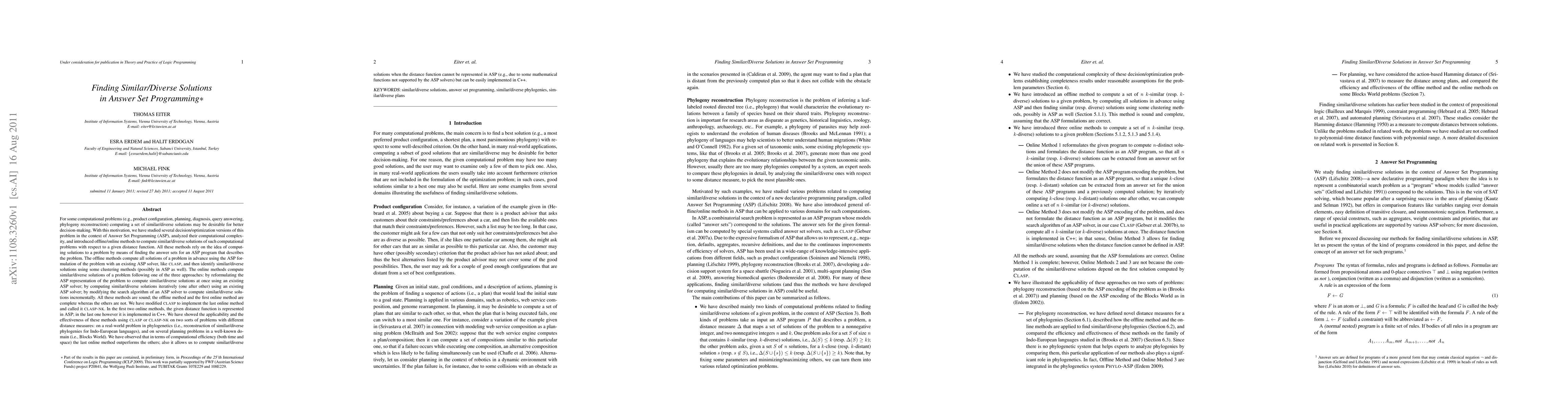 This paper explores methods for finding similar/diverse solutions in Answer Set Programming (ASP) for various computational problems. It introduces both offline and online techniques, with the latter including reformulating ASP, iterative computation, and modifying an ASP solver (Clasp-NK). The study demonstrates the effectiveness of these methods on tasks like phylogeny reconstruction and planning, showing that the modified solver (Clasp-NK) is computationally efficient and flexible for non-ASP distance functions.