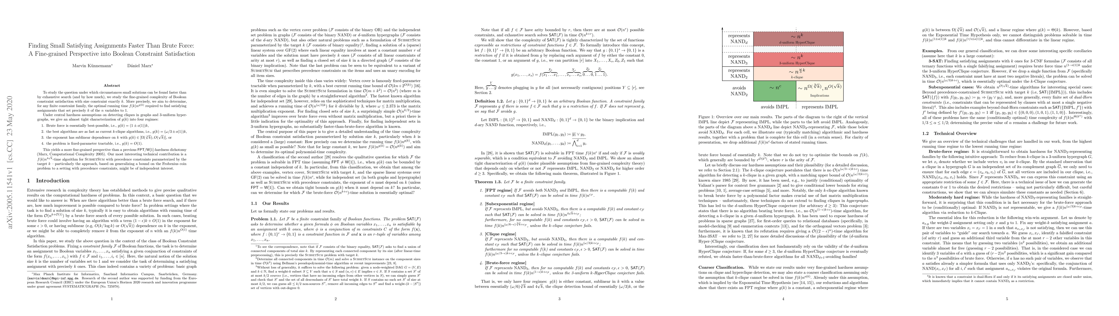 To study the question under which circumstances small solutions can be found faster than by exhaustive search (and by how much), we study the fine-grained complexity of Boolean constraint satisfaction with size constraint exactly $k$. More precisely, we aim to determine, for any finite constraint family, the optimal running time $f(k)n^{g(k)}$ required to find satisfying assignments that set precisely $k$ of the $n$ variables to $1$. Under central hardness assumptions on detecting cliques in graphs and 3-uniform hypergraphs, we give an almost tight characterization of $g(k)$ into four regimes: (1) Brute force is essentially best-possible, i.e., $g(k) = (1\pm o(1))k$, (2) the best algorithms are as fast as current $k$-clique algorithms, i.e., $g(k)=(\omega/3\pm o(1))k$, (3) the exponent has sublinear dependence on $k$ with $g(k) \in [\Omega(\sqrt[3]{k}), O(\sqrt{k})]$, or (4) the problem is fixed-parameter tractable, i.e., $g(k) = O(1)$. This yields a more fine-grained perspective than a previous FPT/W[1]-hardness dichotomy (Marx, Computational Complexity 2005). Our most interesting technical contribution is a $f(k)n^{4\sqrt{k}}$-time algorithm for SubsetSum with precedence constraints parameterized by the target $k$ -- particularly the approach, based on generalizing a bound on the Frobenius coin problem to a setting with precedence constraints, might be of independent interest.