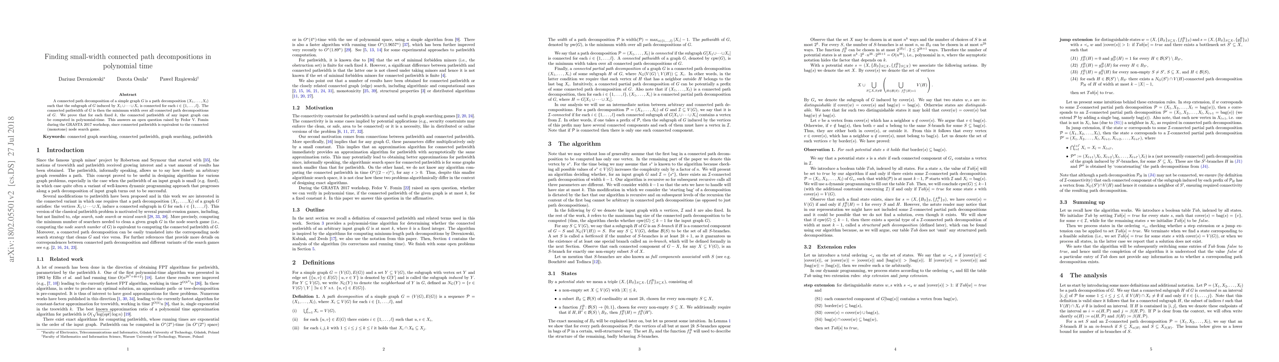 This paper proves that the connected pathwidth of a graph can be computed in polynomial time for any fixed width $k$, resolving an open question posed by Fedor V. Fomin. This finding is significant for understanding the connected (monotone) node search game.