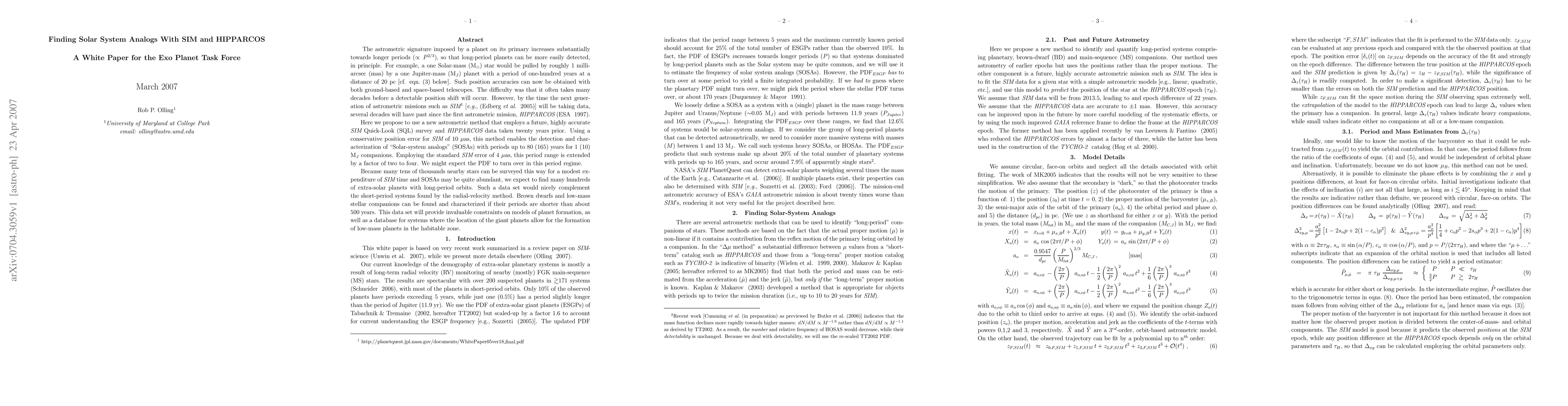 This paper proposes using a combination of data from the upcoming SIM astrometric mission and the HIPPARCOS mission to detect long-period planets around nearby stars. It suggests that this method can identify Solar-system analogs with periods up to 240 years, complementing short-period systems found by radial-velocity methods and providing valuable data for planet formation models.