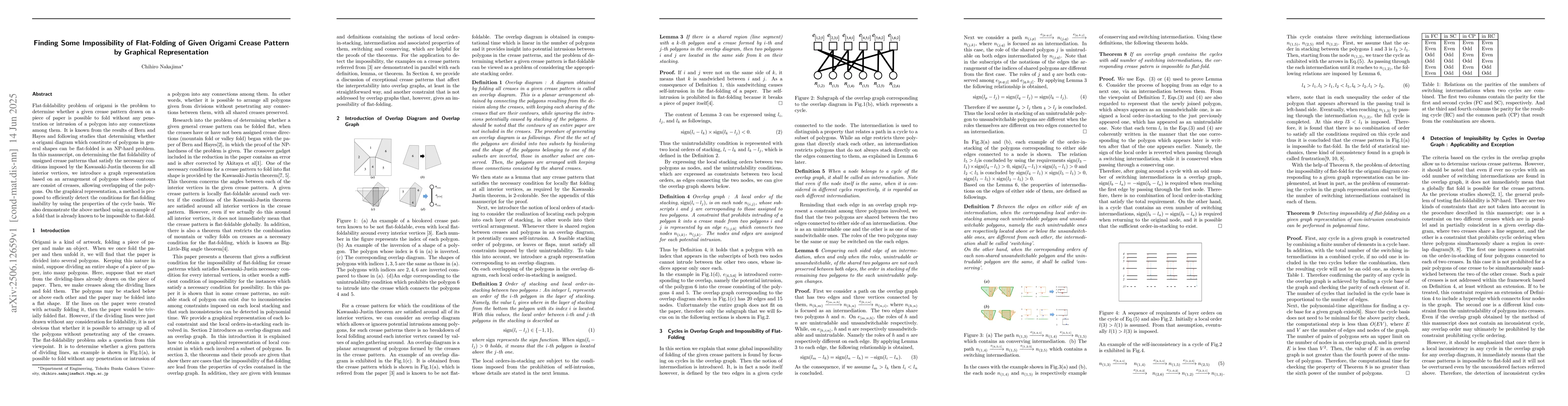 Flat-foldability problem of origami is the problem to determine whether a given crease pattern drawn on a piece of paper is possible to fold without any penetration or intrusion of a polygon into any connections among them. It is known from the results of Bern and Hayes and following studies that determining whether an origami diagram which constitute of polygons in general shapes can be flat-folded is an NP-hard problem. In this manuscript, on determining the flat foldability of unsigned crease patterns that satisfy the necessary conditions imposed by the Kawasaki-Justin theorem for all interior vertices, we introduce a graph representation based on an arrangement of polygons whose contours are consist of creases, allowing overlapping of the polygons. On the graphical representation, a method is proposed to efficiently detect the conditions for flat-folding inability by using the properties of the cycle basis. We also demonstrate the above method using an example of a fold that is already known to be impossible to flat-fold.