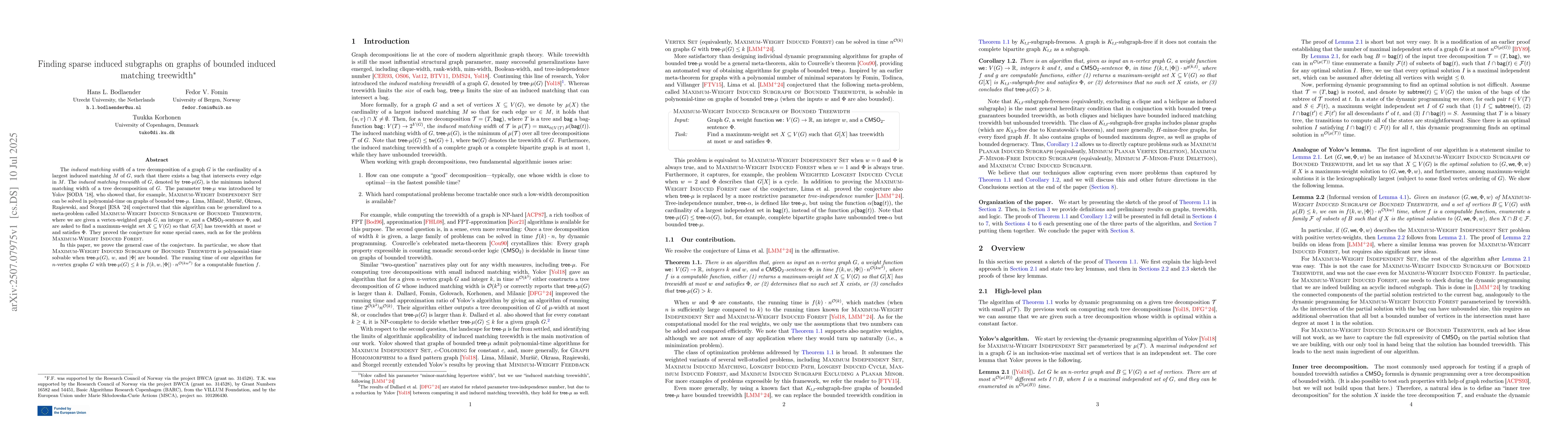 The induced matching width of a tree decomposition of a graph $G$ is the cardinality of a largest induced matching $M$ of $G$, such that there exists a bag that intersects every edge in $M$. The induced matching treewidth of a graph $G$, denoted by $\mathsf{tree-}\mu(G)$, is the minimum induced matching width of a tree decomposition of $G$. The parameter $\mathsf{tree-}\mu$ was introduced by Yolov [SODA '18], who showed that, for example, Maximum-Weight Independent Set can be solved in polynomial-time on graphs of bounded $\mathsf{tree-}\mu$. Lima, Milani\v{c}, Mur\v{s}i\v{c}, Okrasa, Rz\k{a}\.zewski, and \v{S}torgel [ESA '24] conjectured that this algorithm can be generalized to a meta-problem called Maximum-Weight Induced Subgraph of Bounded Treewidth, where we are given a vertex-weighted graph $G$, an integer $w$, and a $\mathsf{CMSO}_2$-sentence $\Phi$, and are asked to find a maximum-weight set $X \subseteq V(G)$ so that $G[X]$ has treewidth at most $w$ and satisfies $\Phi$. They proved the conjecture for some special cases, such as for the problem Maximum-Weight Induced Forest. In this paper, we prove the general case of the conjecture. In particular, we show that Maximum-Weight Induced Subgraph of Bounded Treewidth is polynomial-time solvable when $\mathsf{tree-}\mu(G)$, $w$, and $|\Phi|$ are bounded. The running time of our algorithm for $n$-vertex graphs $G$ with $\mathsf{tree} - \mu(G) \le k$ is $f(k, w, |\Phi|) \cdot n^{O(k w^2)}$ for a computable function $f$.