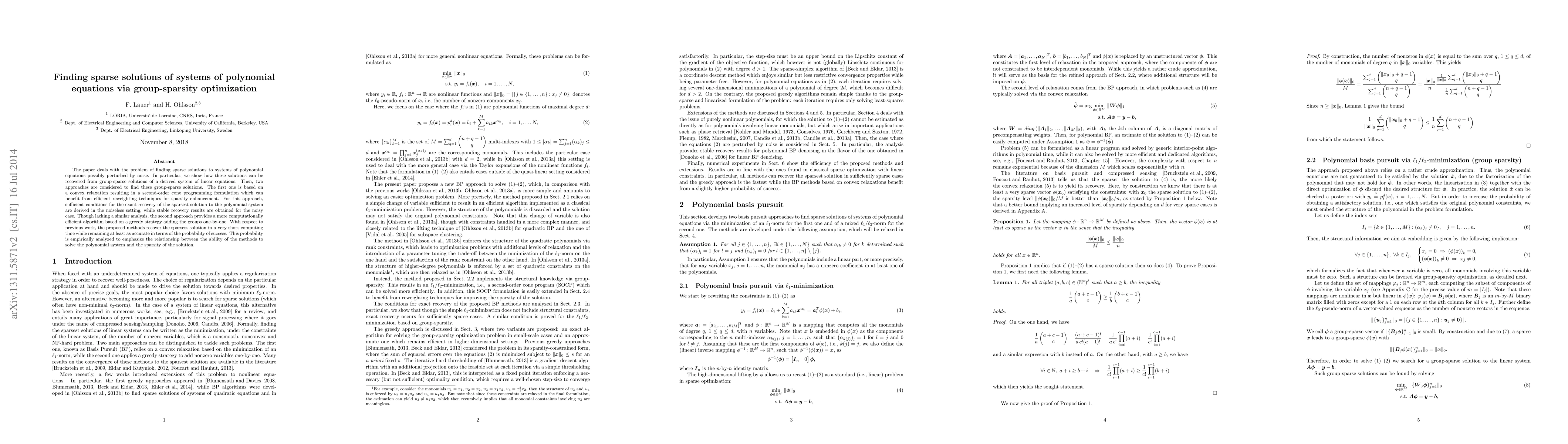 Researchers developed methods to find sparse solutions of systems of polynomial equations by leveraging group-sparse optimization, offering a promising approach for recovering sparsest solutions with high accuracy and efficiency.