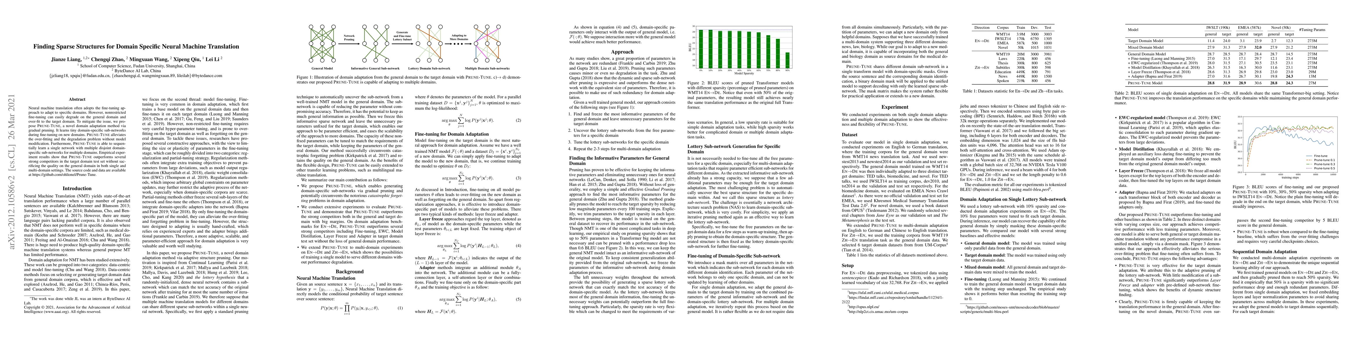 This paper proposes Prune-Tune, a novel domain adaptation method for neural machine translation that uses gradual pruning to learn domain-specific sub-networks, mitigating overfitting and degradation without model modification. Empirical results show it outperforms competitors in target domain tests while maintaining general domain quality.
