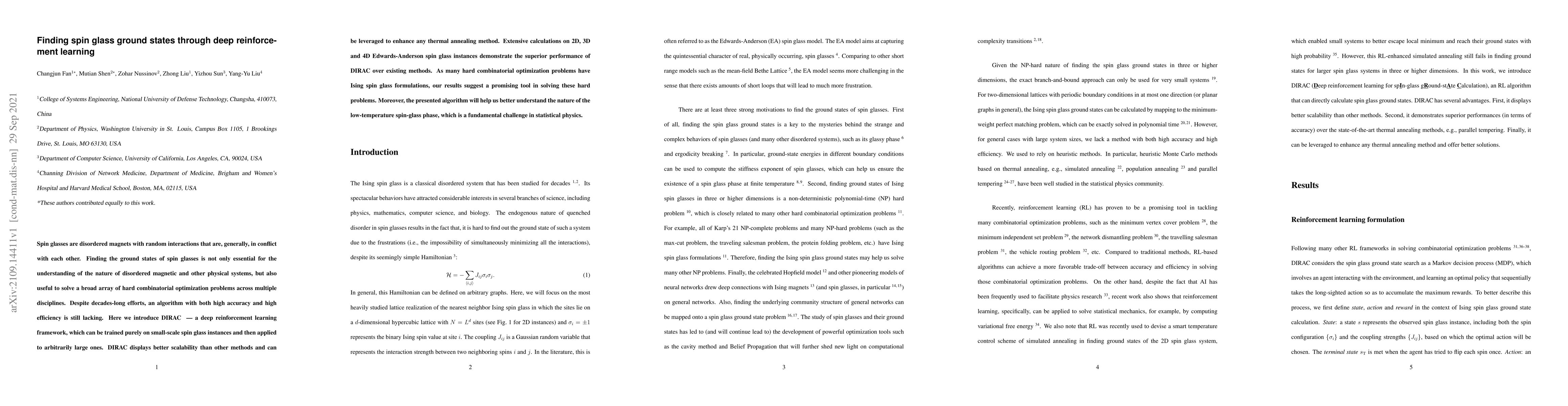 This paper introduces DIRAC, a deep reinforcement learning framework for finding spin glass ground states, demonstrating superior scalability and performance over existing methods. The algorithm shows promise in solving hard combinatorial optimization problems and contributes to understanding the low-temperature spin-glass phase in statistical physics.