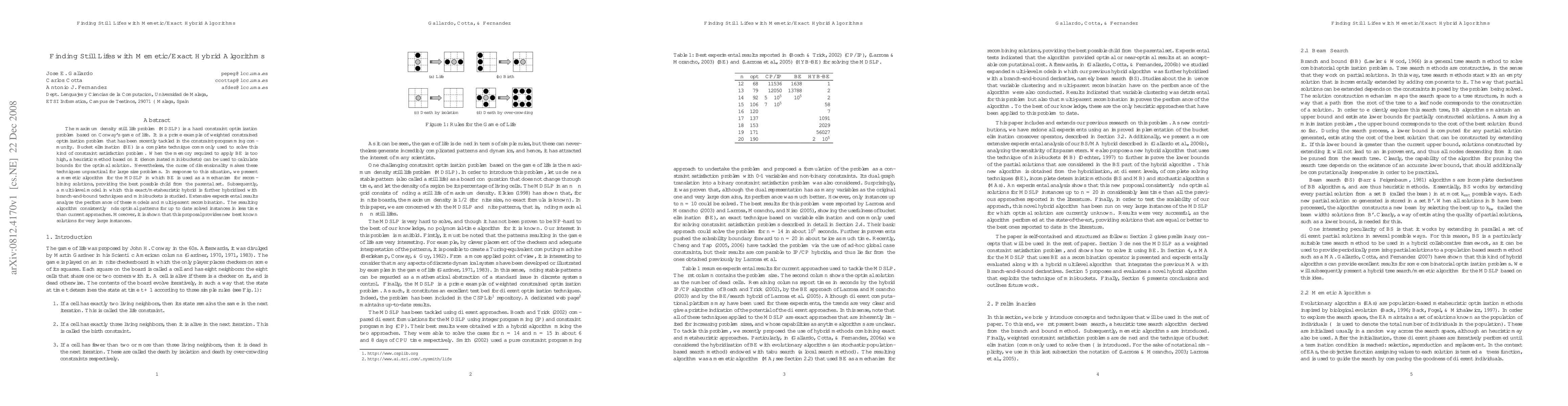 This paper proposes a memetic algorithm combining bucket elimination and hybrid optimization techniques to solve the maximum density still life problem (MDSLP), a complex constraint optimization problem. The algorithm efficiently finds optimal solutions faster than existing methods, even for large instances, by leveraging exact methods and heuristics.