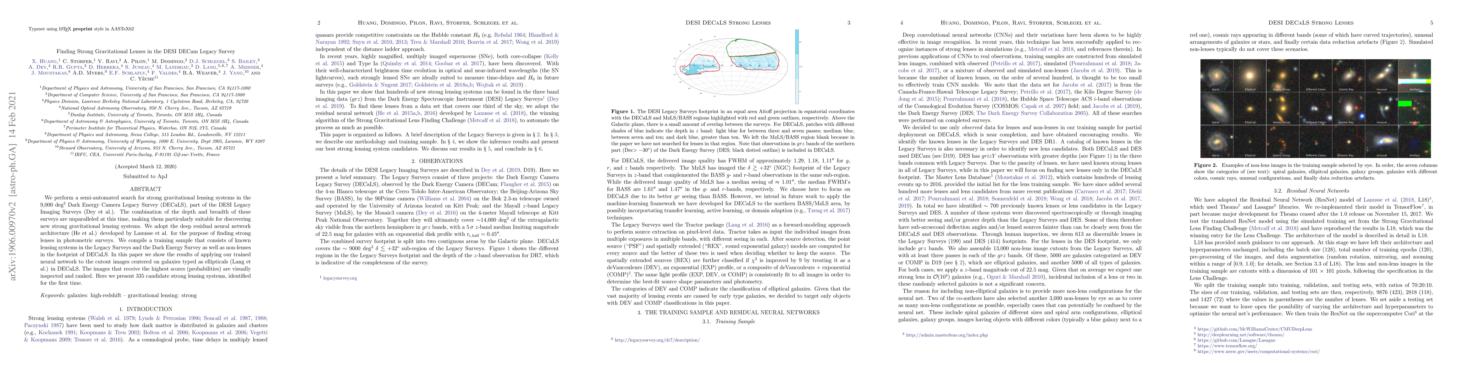 We perform a semi-automated search for strong gravitational lensing systems in the 9,000 deg$^2$ Dark Energy Camera Legacy Survey (DECaLS), part of the DESI Legacy Imaging Surveys (Dey et al.). The combination of the depth and breadth of these surveys are unparalleled at this time, making them particularly suitable for discovering new strong gravitational lensing systems. We adopt the deep residual neural network architecture (He et al.) developed by Lanusse et al. for the purpose of finding strong lenses in photometric surveys. We compile a training set that consists of known lensing systems in the Legacy Surveys and DES as well as non-lenses in the footprint of DECaLS. In this paper we show the results of applying our trained neural network to the cutout images centered on galaxies typed as ellipticals (Lang et al.) in DECaLS. The images that receive the highest scores (probabilities) are visually inspected and ranked. Here we present 335 candidate strong lensing systems, identified for the first time.