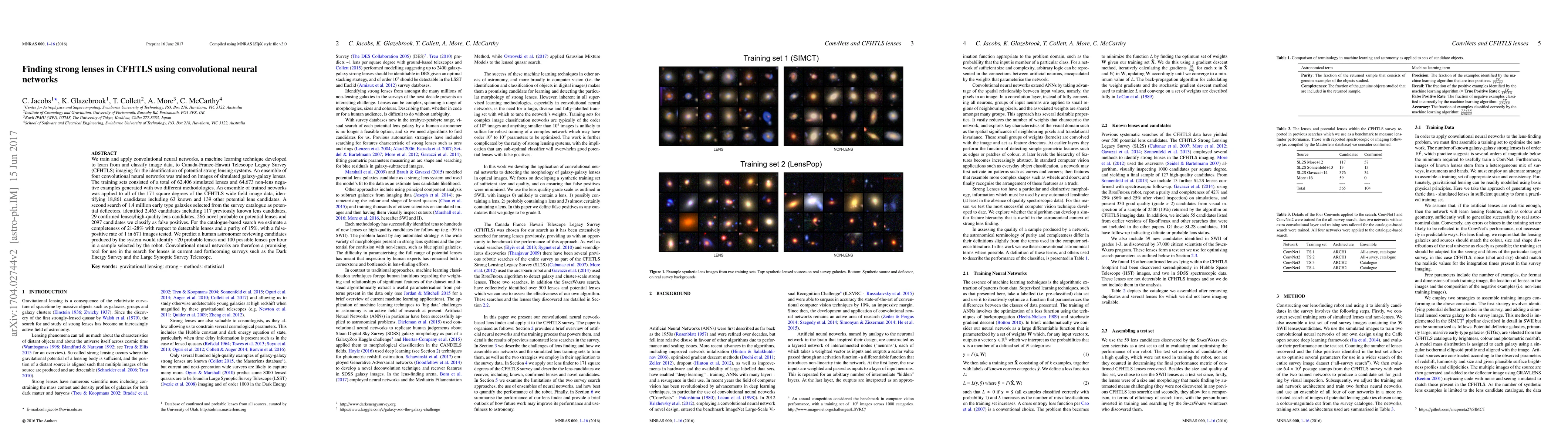 This paper uses convolutional neural networks to identify strong lensing systems in the CFHTLS survey, achieving high accuracy and identifying numerous potential lens candidates. The method shows promising results for future large-scale astronomical surveys.