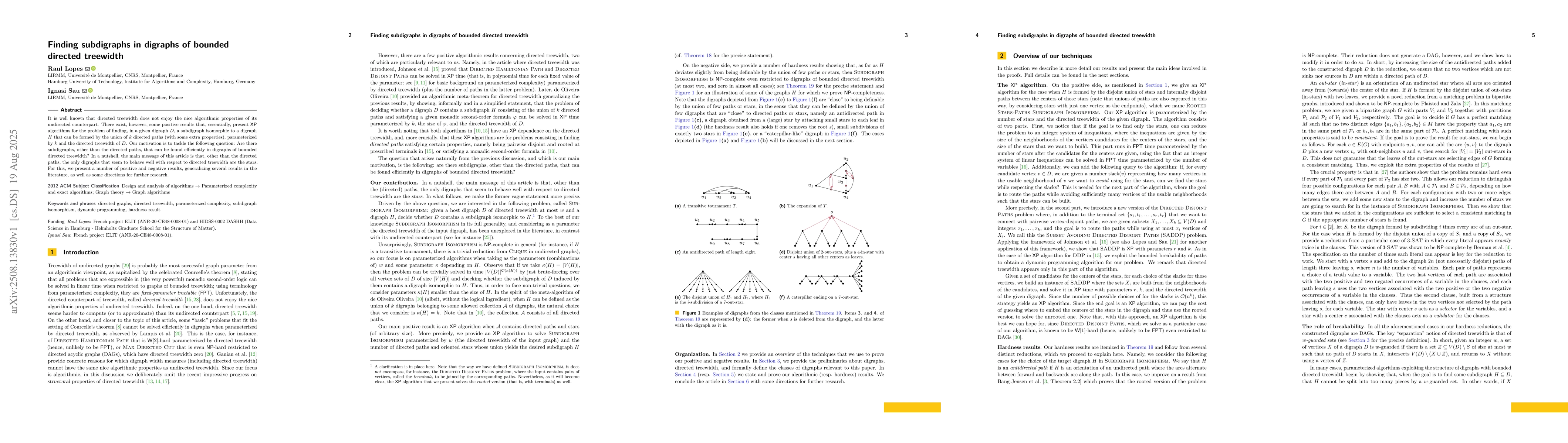 The paper presents novel XP and FPT algorithms for finding subdigraphs isomorphic to rooted stars and disjoint paths in digraphs of bounded directed treewidth, along with generalizations and extensions of known results.