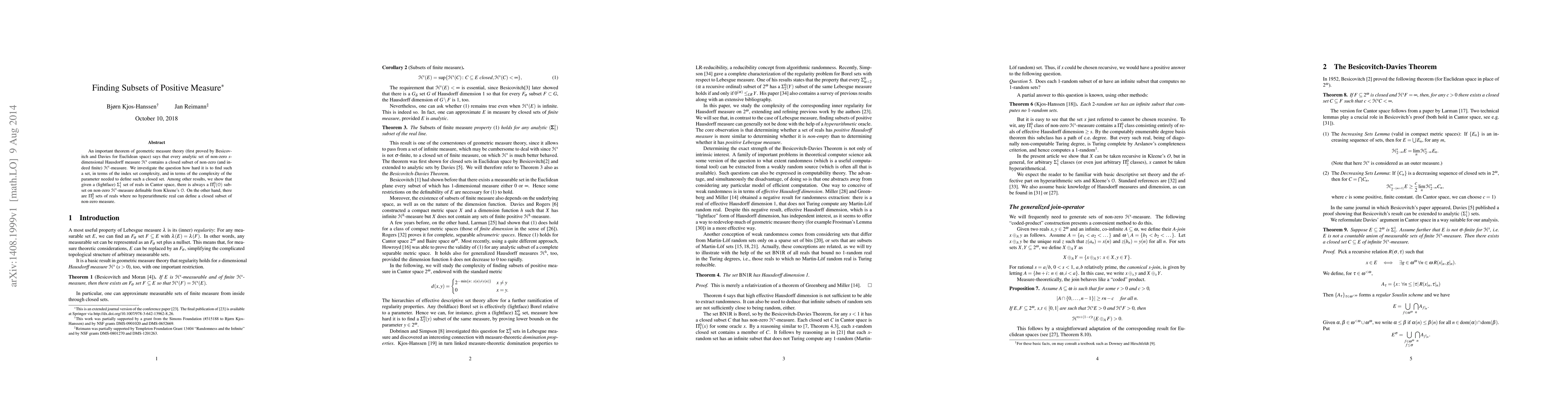 An important theorem of geometric measure theory (first proved by Besicovitch and Davies for Euclidean space) says that every analytic set of non-zero $s$-dimensional Hausdorff measure $\mathcal H^s$ contains a closed subset of non-zero (and indeed finite) $\mathcal H^s$-measure. We investigate the question how hard it is to find such a set, in terms of the index set complexity, and in terms of the complexity of the parameter needed to define such a closed set. Among other results, we show that given a (lightface) $\Sigma^1_1$ set of reals in Cantor space, there is always a $\Pi^0_1(\mathcal{O})$ subset on non-zero $\mathcal H^s$-measure definable from Kleene's $\mathcal O$. On the other hand, there are $\Pi^0_2$ sets of reals where no hyperarithmetic real can define a closed subset of non-zero measure.