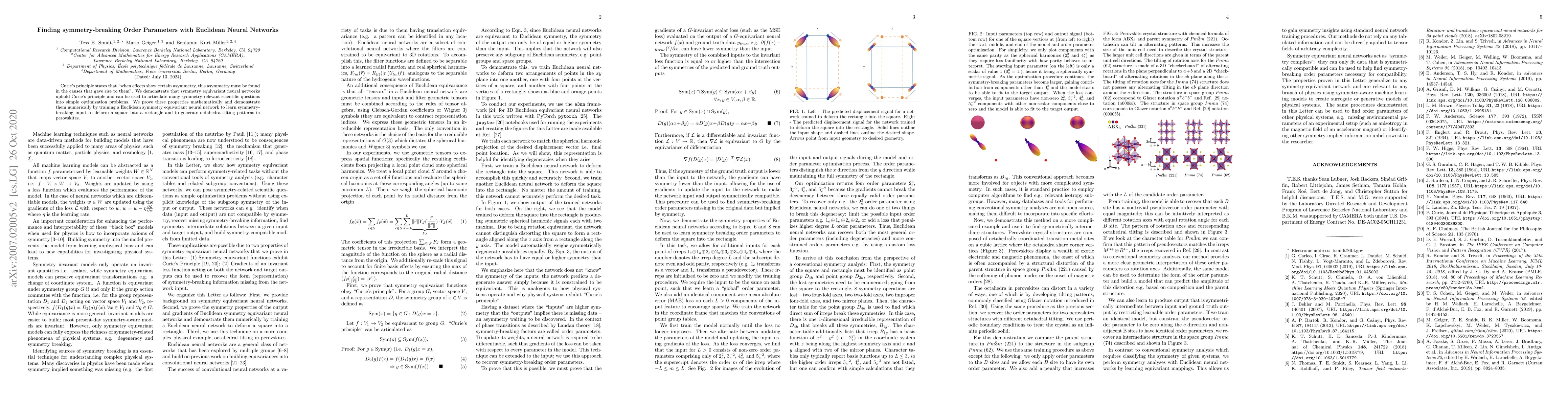 This paper shows that symmetry equivariant neural networks uphold Curie's principle by finding symmetry breaking order parameters, and it demonstrates this through mathematical proofs and numerical experiments using Euclidean neural networks to deform shapes and model perovskite tilting patterns.