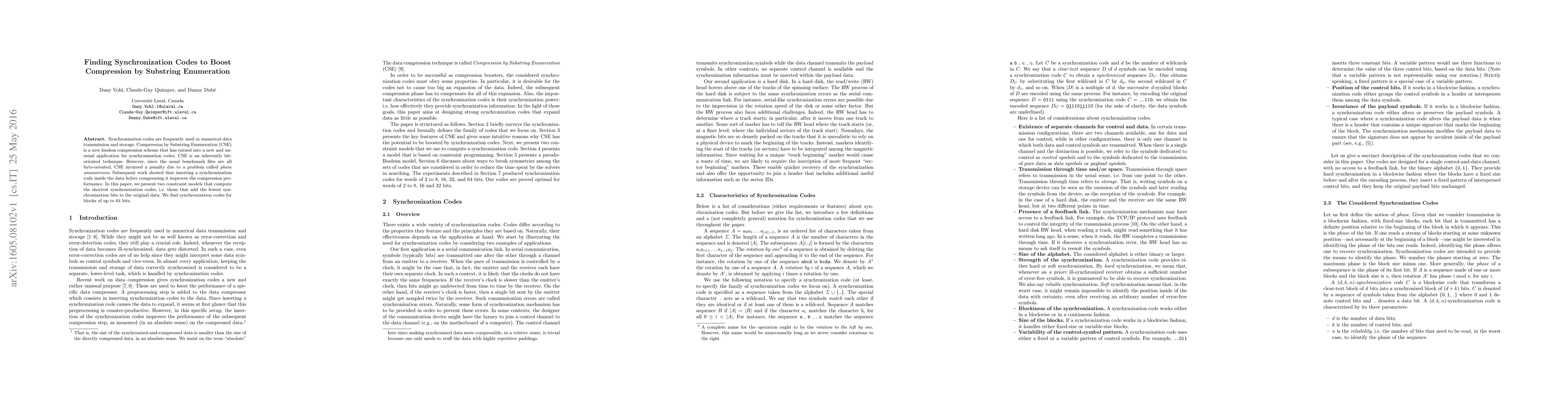 Researchers developed two constraint models to find synchronization codes that add minimal bits to data, improving compression performance for numerical data transmission and storage.