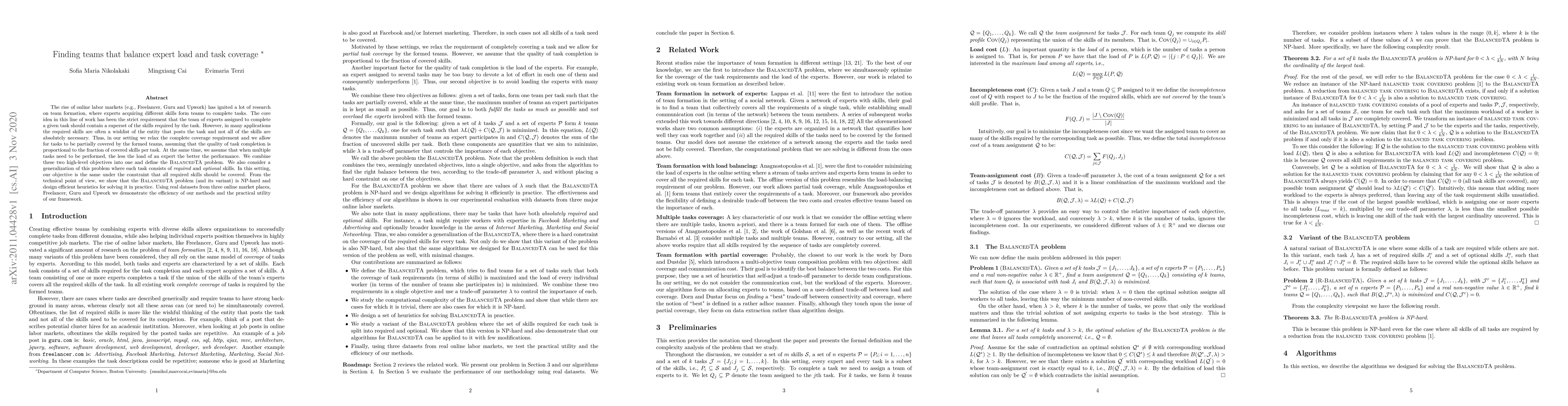The rise of online labor markets (e.g., Freelancer, Guru and Upwork) has ignited a lot of research on team formation, where experts acquiring different skills form teams to complete tasks. The core idea in this line of work has been the strict requirement that the team of experts assigned to complete a given task should contain a superset of the skills required by the task. However, in many applications the required skills are often a wishlist of the entity that posts the task and not all of the skills are absolutely necessary. Thus, in our setting we relax the complete coverage requirement and we allow for tasks to be partially covered by the formed teams, assuming that the quality of task completion is proportional to the fraction of covered skills per task. At the same time, we assume that when multiple tasks need to be performed, the less the load of an expert the better the performance. We combine these two high-level objectives into one and define the BalancedTA problem. We also consider a generalization of this problem where each task consists of required and optional skills. In this setting, our objective is the same under the constraint that all required skills should be covered. From the technical point of view, we show that the BalancedTA problem (and its variant) is NP-hard and design efficient heuristics for solving it in practice. Using real datasets from three online market places, Freelancer, Guru and Upwork we demonstrate the efficiency of our methods and the practical utility of our framework.