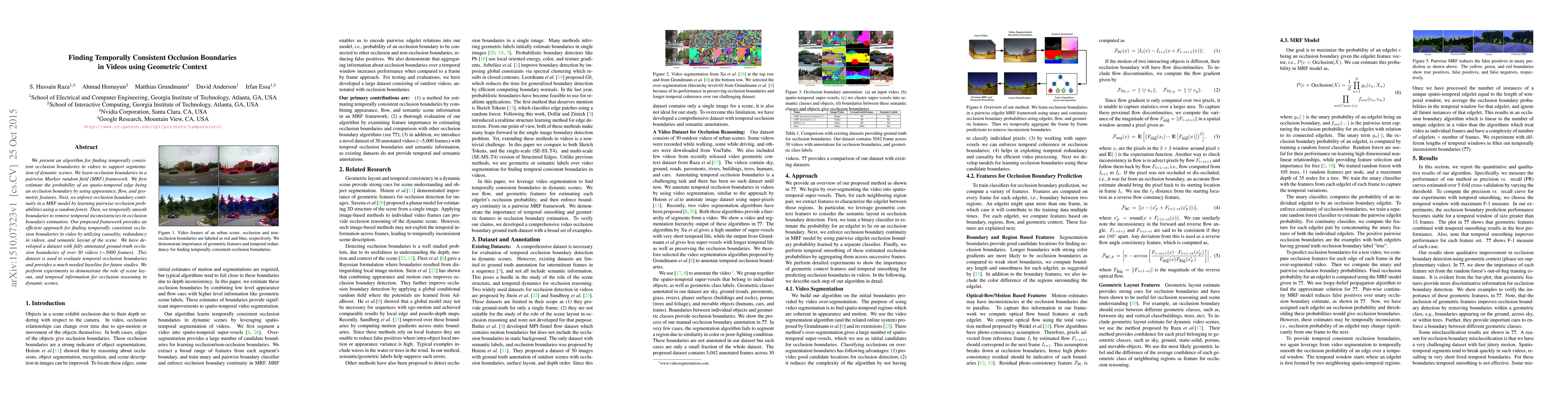 This paper proposes an algorithm for identifying temporally consistent occlusion boundaries in videos using a Markov random field framework, leveraging appearance, flow, and geometric features. The authors introduce a dataset with annotated occlusion boundaries and demonstrate the effectiveness of their approach using scene layout and temporal information.