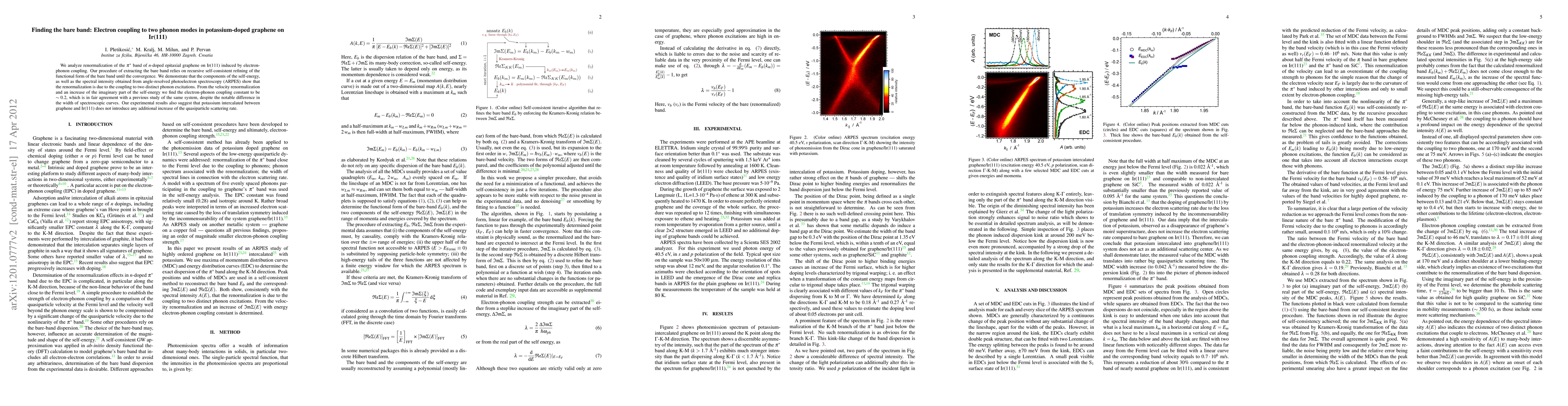 We analyze renormalization of the pi band of n-doped epitaxial graphene on Ir(111) induced by electron-phonon coupling. Our procedure of extracting the bare band relies on recursive self-consistent refining of the functional form of the bare-band until the convergence. We demonstrate that the components of the self-energy, as well as the spectral intensity obtained from angle-resolved photoelectron spectroscopy (ARPES) show that the renormalization is due to the coupling to two distinct phonon excitations. From the velocity renormalization and an increase of the imaginary part of the self-energy we find the electron-phonon coupling constant to be ~0.2, which is in fair agreement with a previous study of the same system, despite the notable difference in the width of spectroscopic curves. Our experimental results also suggest that potassium intercalated between graphene and Ir(111) does not introduce any additional increase of the quasiparticle scattering rate.