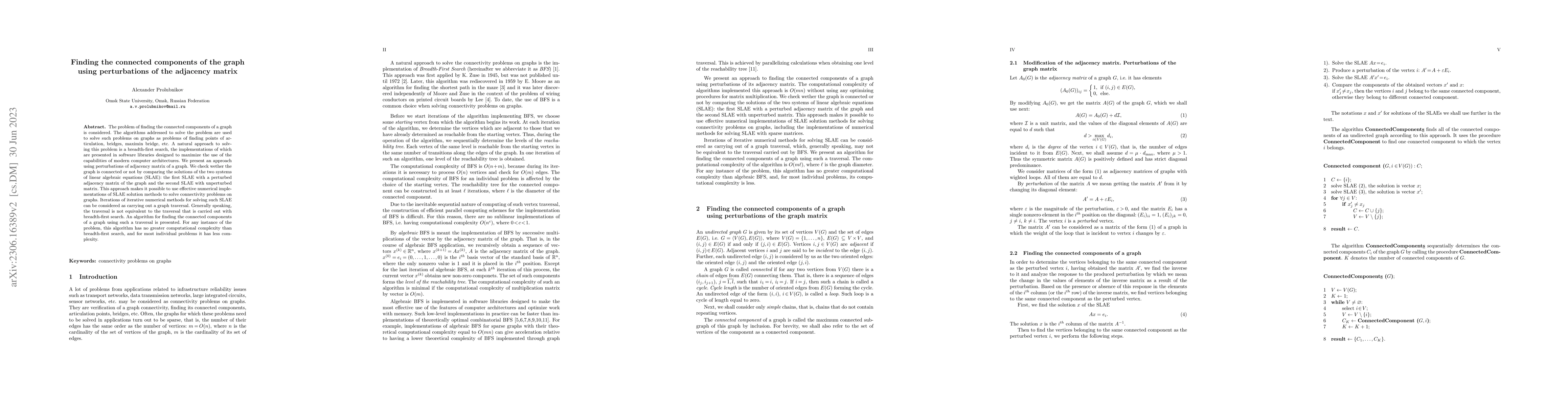 This paper proposes an algorithm for finding the connected components of a graph using perturbations of the adjacency matrix. It compares solutions of linear algebraic equations derived from perturbed and unperturbed adjacency matrices, leveraging numerical methods for efficient computation, and claims comparable or lower computational complexity than breadth-first search.