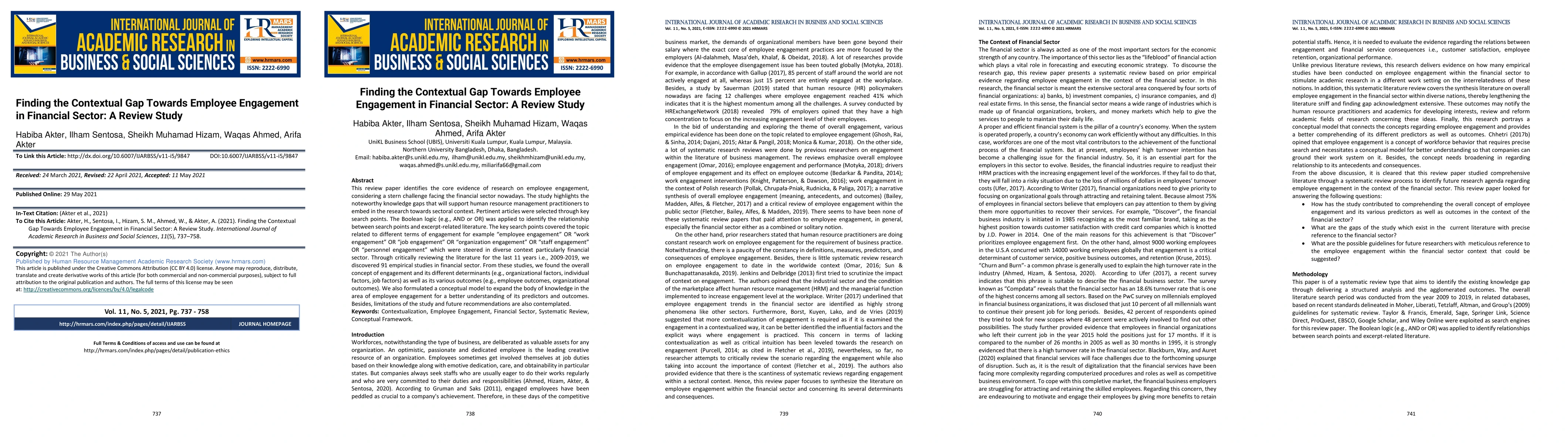 This review paper identifies key research on employee engagement within the financial sector, highlighting significant knowledge gaps to inform human resource management. It formulates a conceptual model to better understand the predictors and outcomes of engagement, based on a critical review of 91 empirical studies from 2009 to 2019.