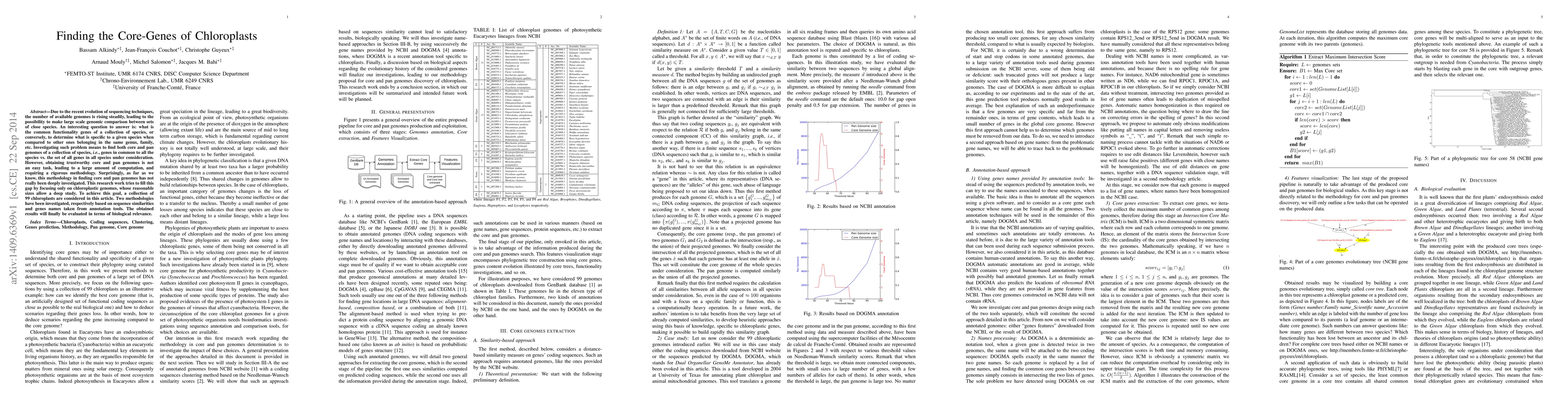 Due to the recent evolution of sequencing techniques, the number of available genomes is rising steadily, leading to the possibility to make large scale genomic comparison between sets of close species. An interesting question to answer is: what is the common functionality genes of a collection of species, or conversely, to determine what is specific to a given species when compared to other ones belonging in the same genus, family, etc. Investigating such problem means to find both core and pan genomes of a collection of species, \textit{i.e.}, genes in common to all the species vs. the set of all genes in all species under consideration. However, obtaining trustworthy core and pan genomes is not an easy task, leading to a large amount of computation, and requiring a rigorous methodology. Surprisingly, as far as we know, this methodology in finding core and pan genomes has not really been deeply investigated. This research work tries to fill this gap by focusing only on chloroplastic genomes, whose reasonable sizes allow a deep study. To achieve this goal, a collection of 99 chloroplasts are considered in this article. Two methodologies have been investigated, respectively based on sequence similarities and genes names taken from annotation tools. The obtained results will finally be evaluated in terms of biological relevance.