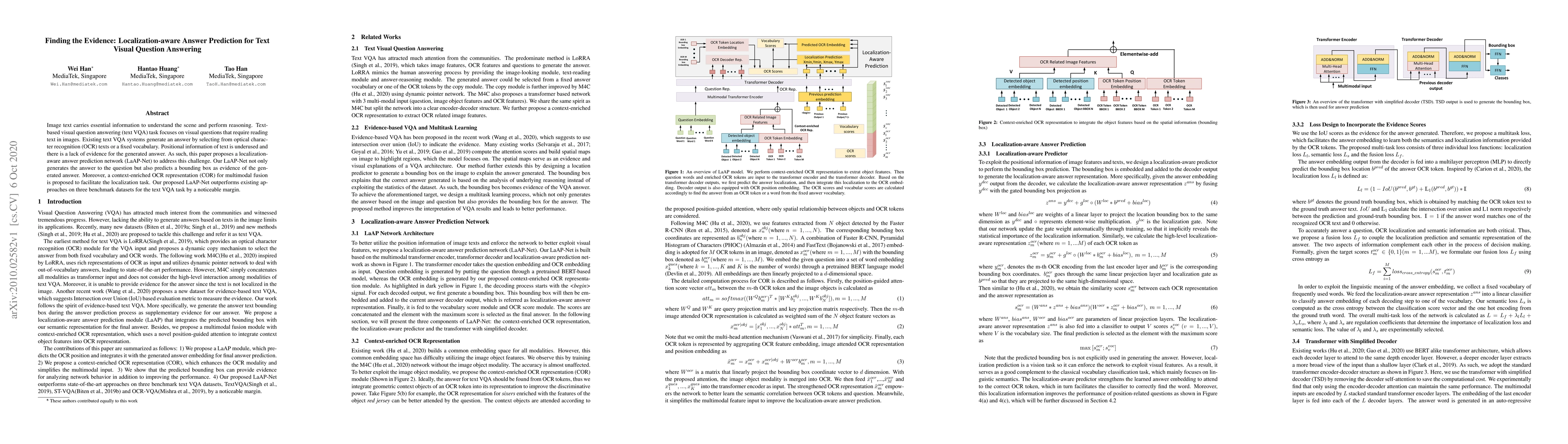 This paper introduces LaAP-Net, a localization-aware answer prediction network for text-based visual question answering (text VQA), which generates answers and predicts bounding boxes as evidence. It also proposes a context-enriched OCR representation for multimodal fusion, outperforming existing methods on benchmark datasets.